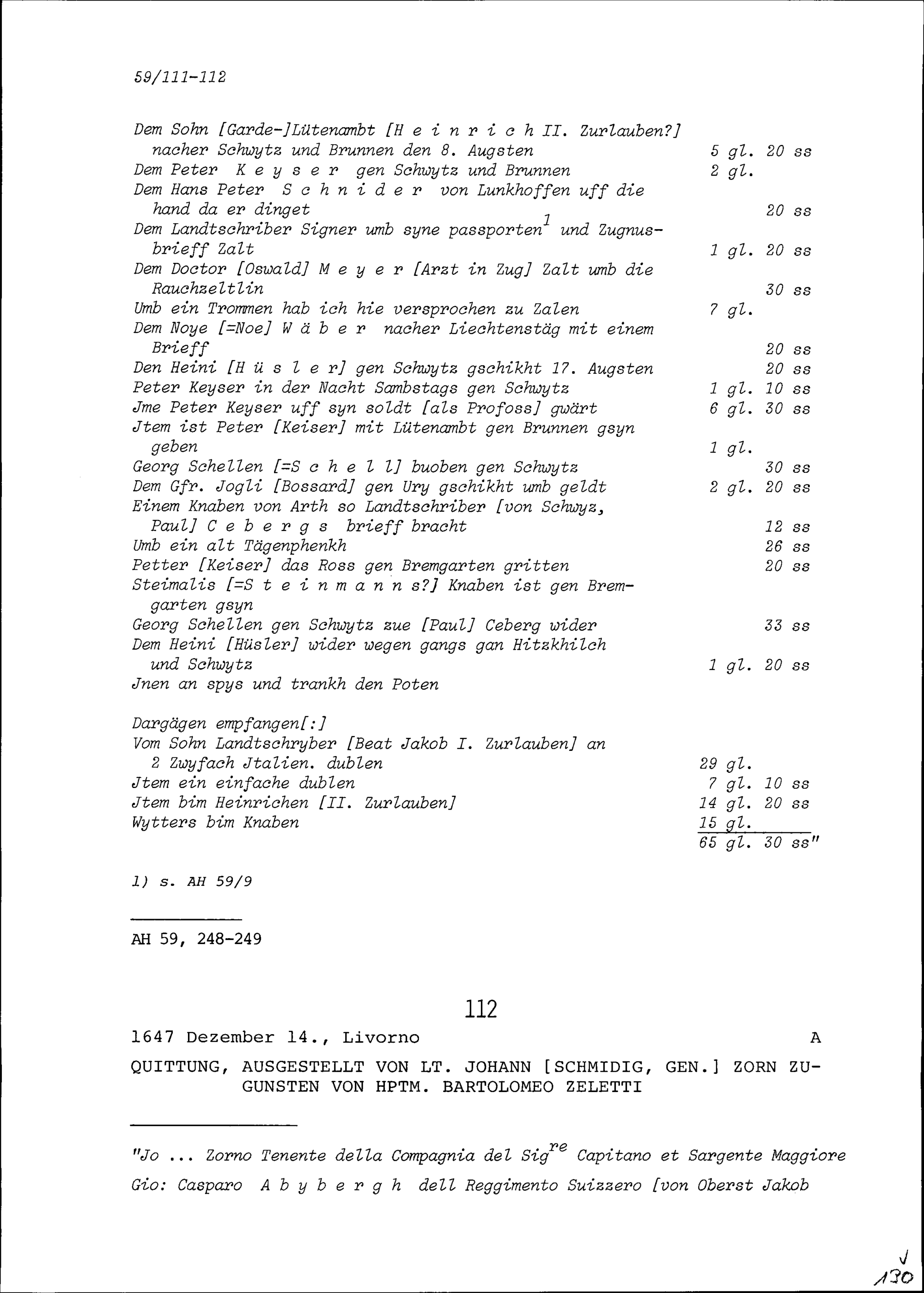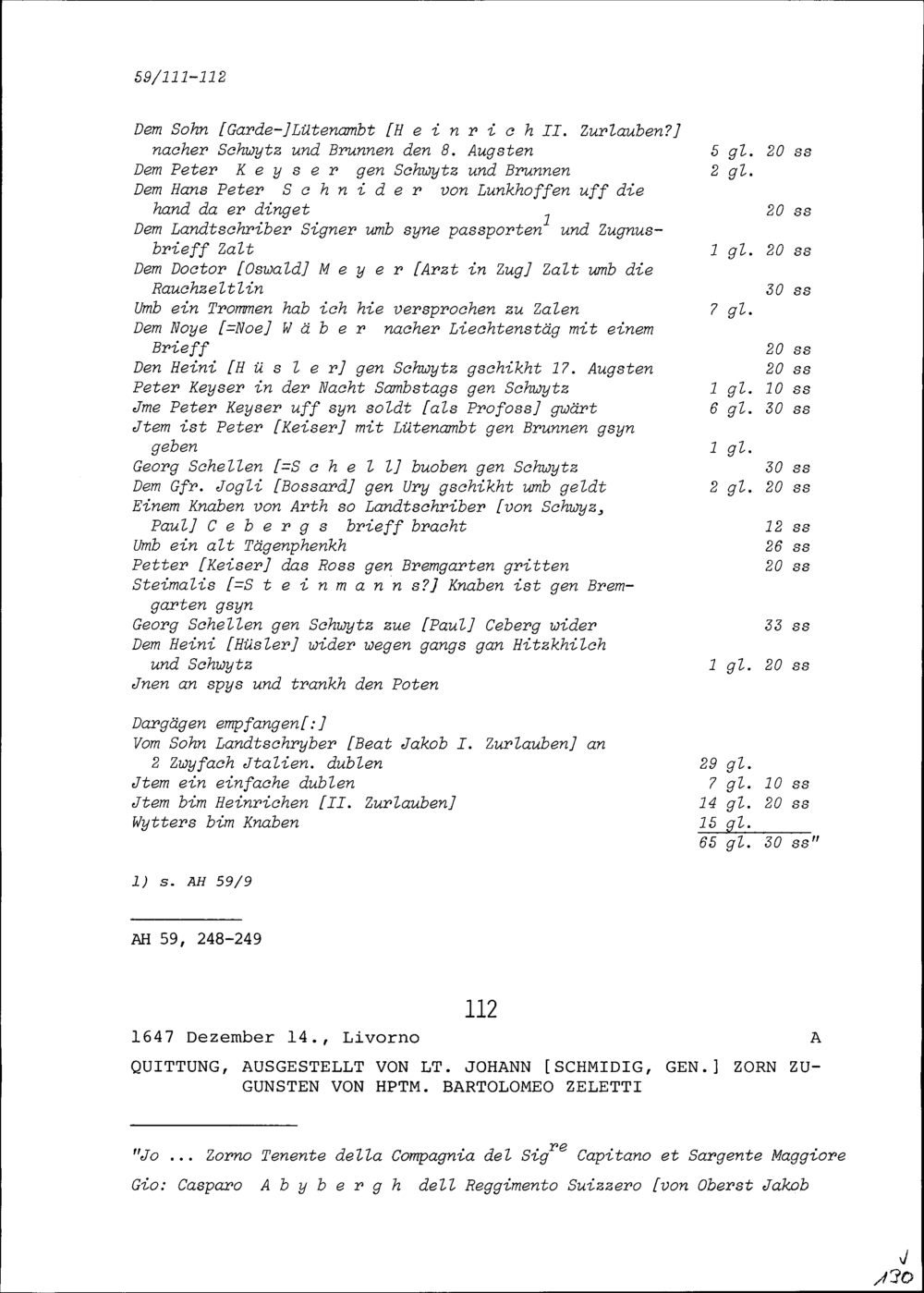 Abrechnung von Beat II. Zurlauben in Zusammenhang mit den Werbungen für die Kompanie von Beat Jakob I. Zurlauben im Regiment Lusser in florentinischen Diensten