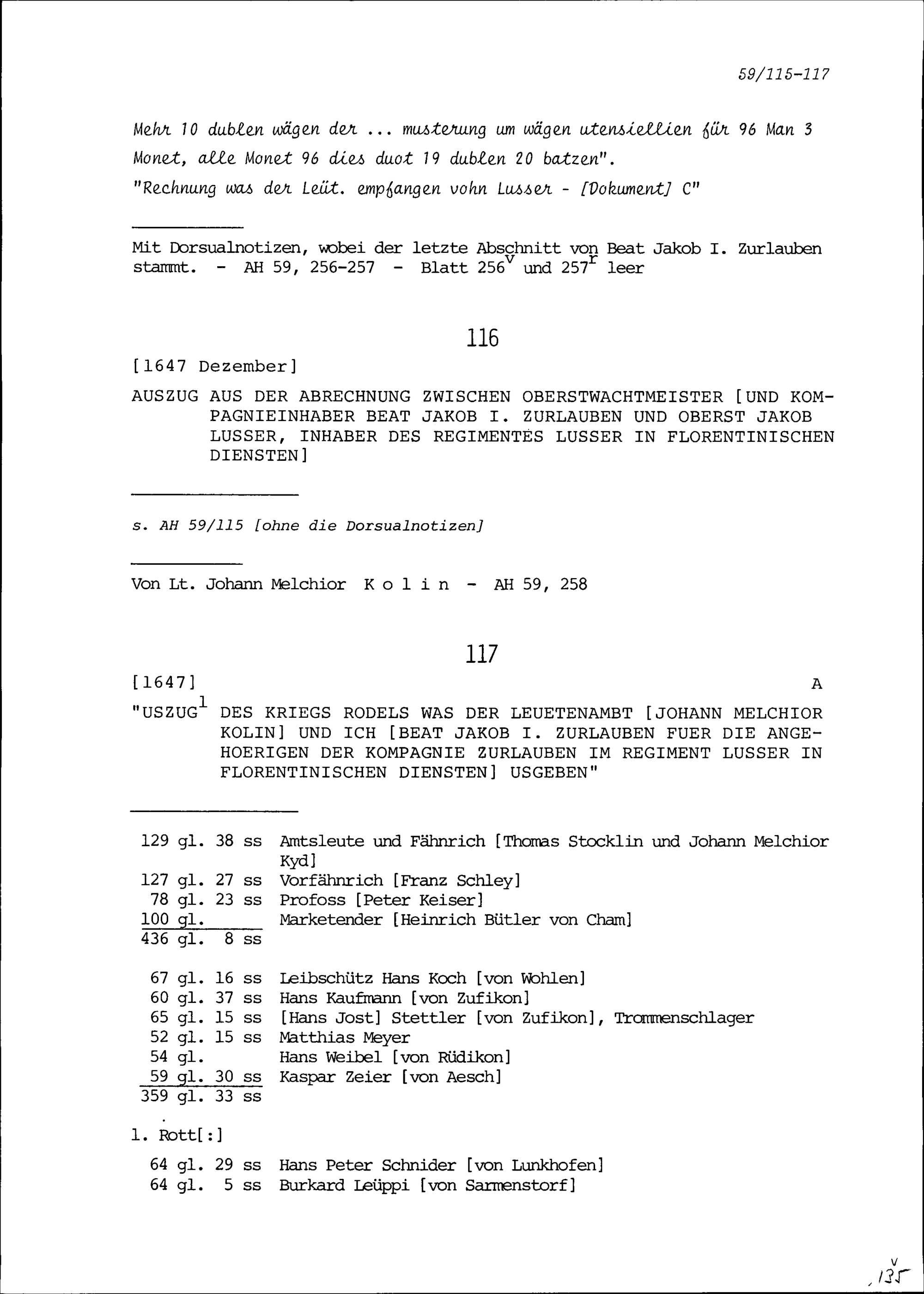 Ausgabenrechnung von Johann Melchior Kolin, Leutnant, und Beat Jakob I. Zurlauben für die Angehörigen der Kompanie Zurlauben