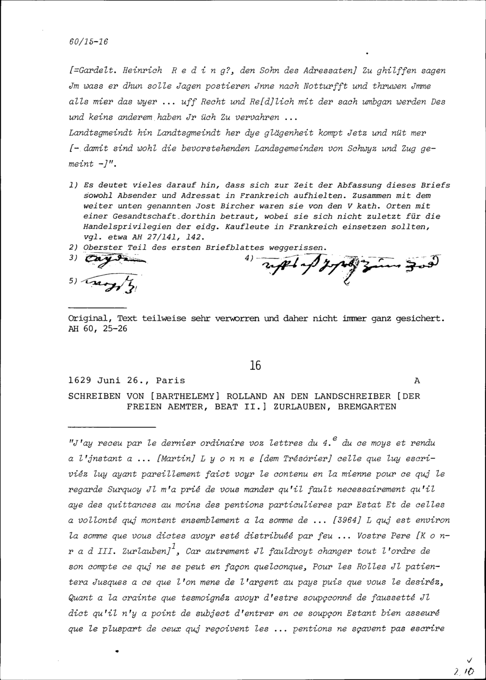 Schreiben von Heinrich Reding an Beat II. Zurlauben, Ammann Zug