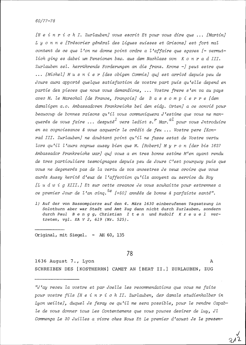 Schreiben von Barthélémy Rolland an Beat II. Zurlauben, Ammann, Zug
