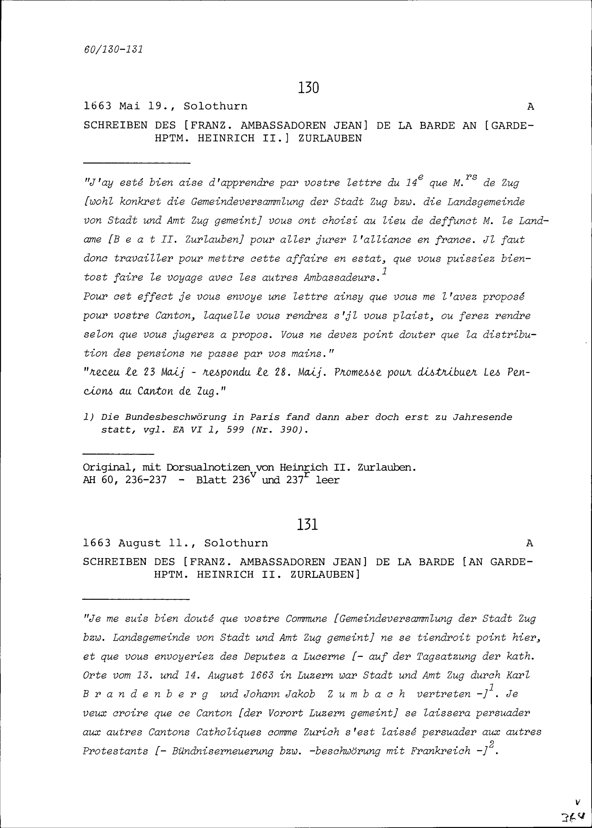 Schreiben von Jean de la Barde, Ambassador von Frankreich, an Heinrich II. Zurlauben, Gardehauptmann