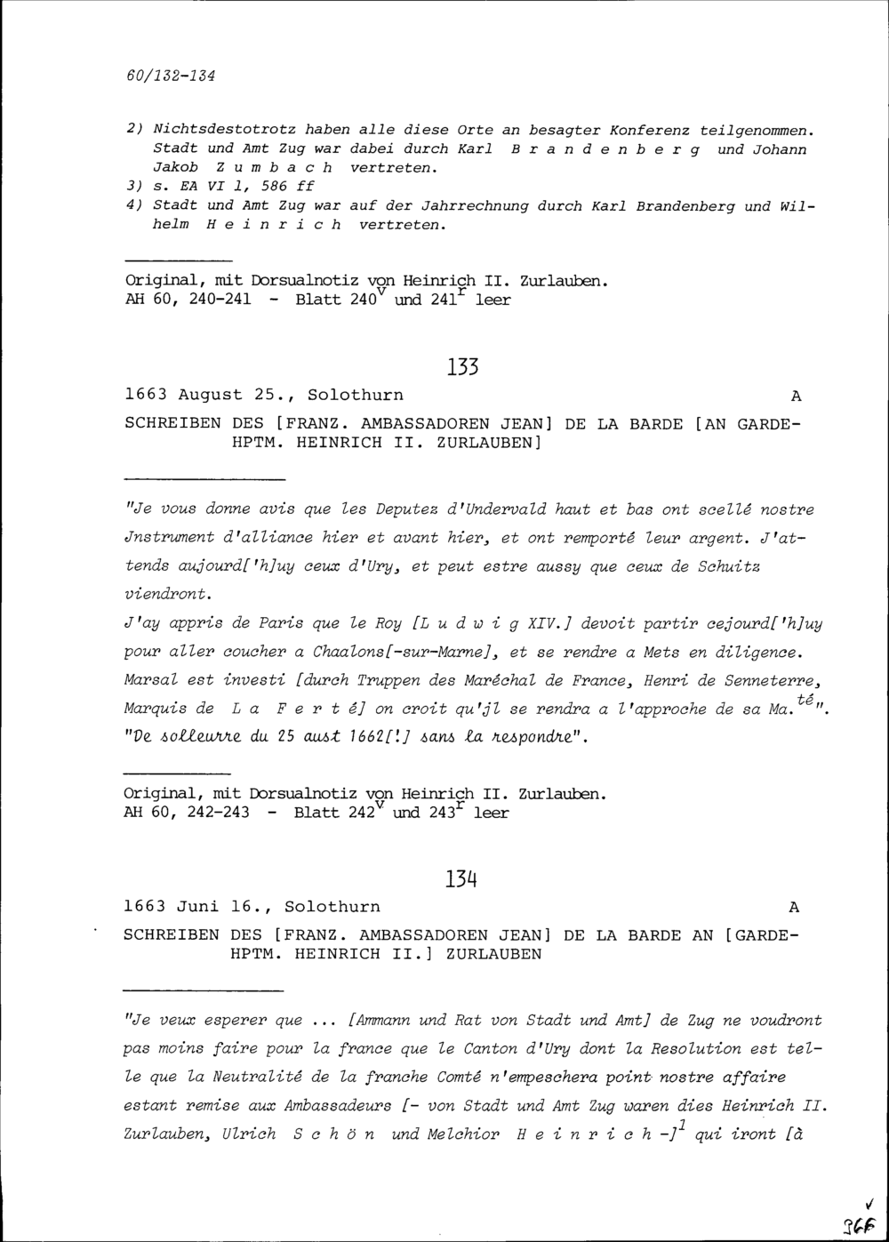 Schreiben von Jean de la Barde, Ambassador von Frankreich, an Heinrich II. Zurlauben, Gardehauptmann