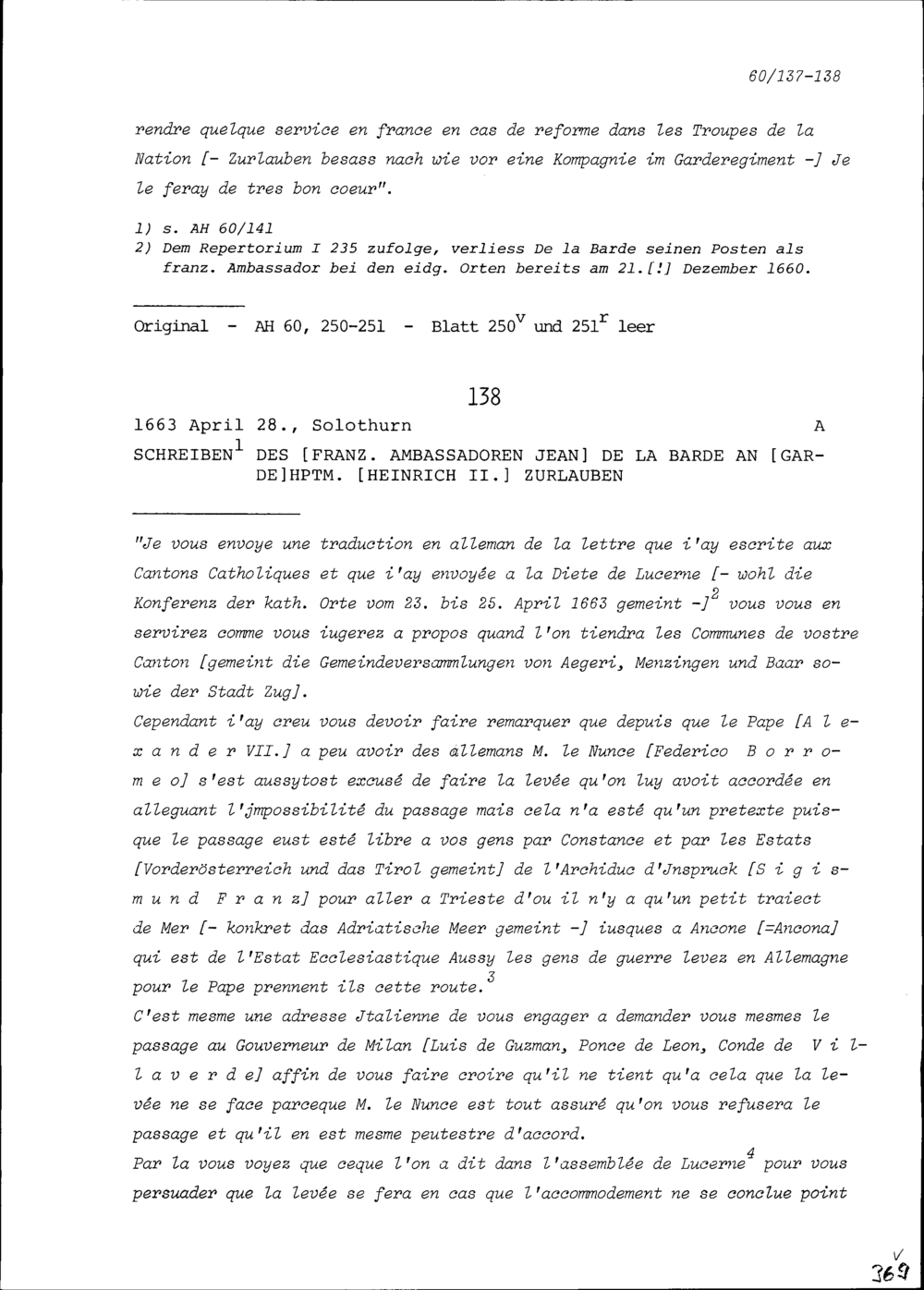 Schreiben von Jean de la Barde, Ambassador von Frankreich, an Heinrich II. Zurlauben, Landvogt der Grafschaft Baden