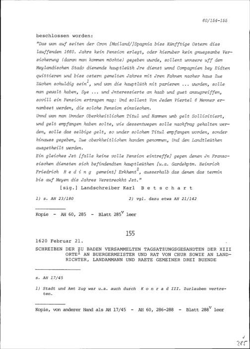 Beschluss der Landsgemeinde von Schwyz bei Ausbleiben der Pensionen, die schwyzerischen Kompanien aus Mailand-Spanien und Frankreich heimzumahnen
