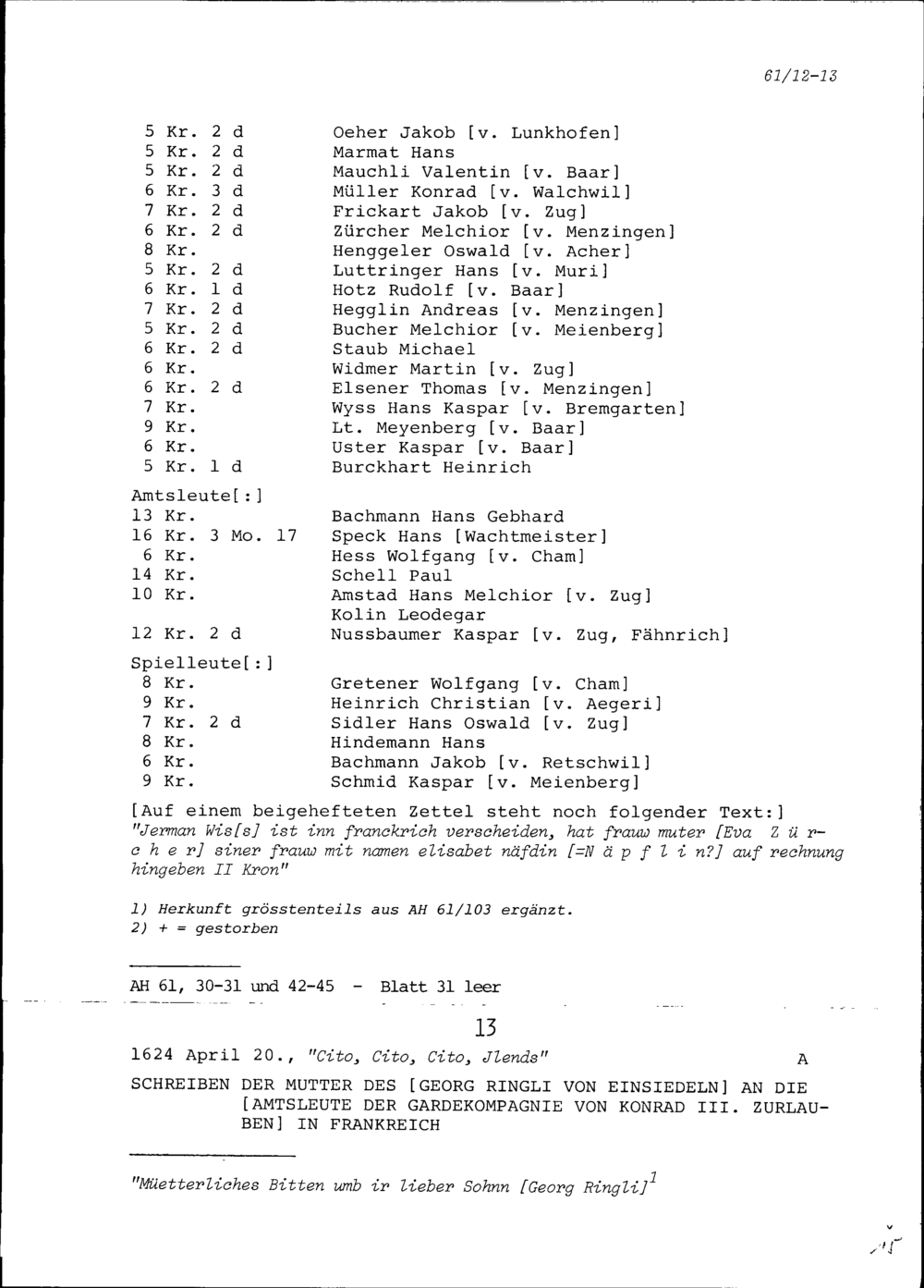 Schulden der Soldaten gegenüber Konrad III. Zurlauben, Gardehauptmann,