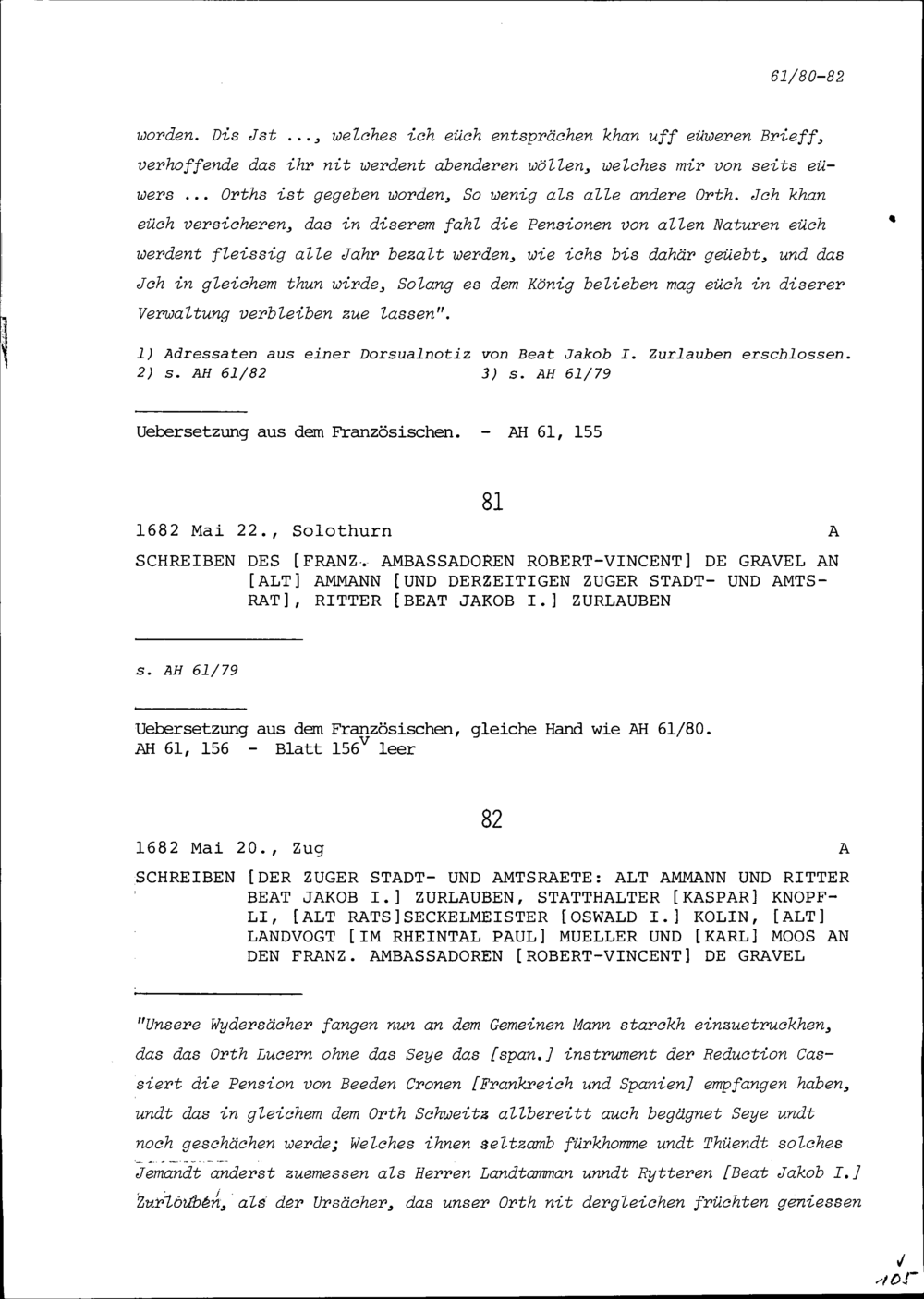 Schreiben von Robert-Vincent de Gravel, Ambassador von Frankreich, an Beat Jakob I. Zurlauben, Zuger Stadt- und Amtsrat und Altammann, an Kaspar Knopfli, Zuger Stadt- und Amtsrat und Statthalter, an Oswald I. Kolin, Zuger Stadt- und Amtsrat und Altratsseckelmeister, an Paul Müller, Zuger Stadt- und Amtsrat und Altlandvogt im Rheintal, und an Karl Moos, Zuger Stadt- und Amtsrat und Hauptmann