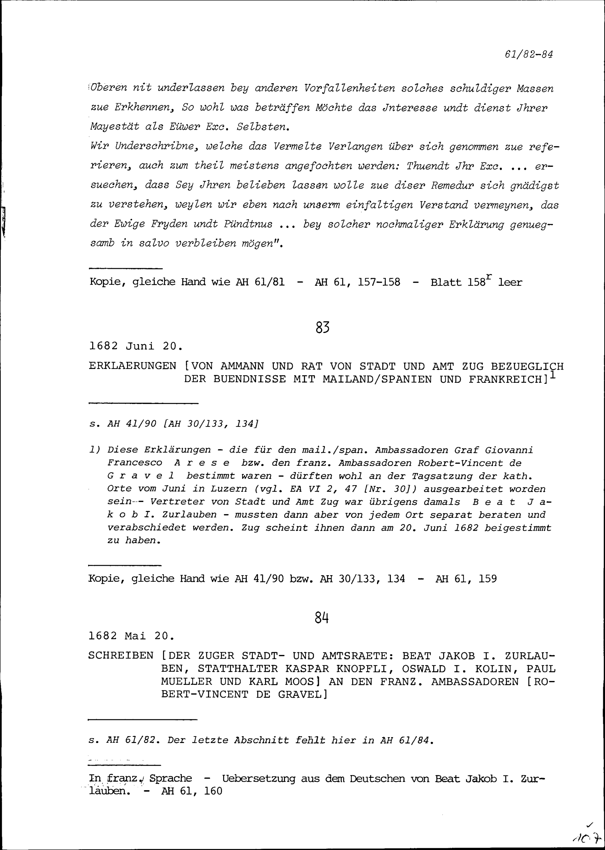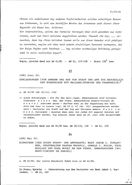Schreiben von Beat Jakob I. Zurlauben, Altammann und Zuger Stadt- und Amtsrat, von Kaspar Knopfli, Statthalter und Zuger Stadt- und Amtsrat, von Oswald I. Kolin, Altratsseckelmeister und Zuger Stadt- und Amtsrat, von Paul Müller, Altlandvogt im Rheintal und Zuger Stadt- und Amtsrat und von Karl Moos, Zuger Stadt- und Amtsrat, an Robert-Vincent de Gravel, Ambassador von Frankreich