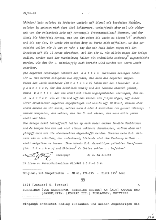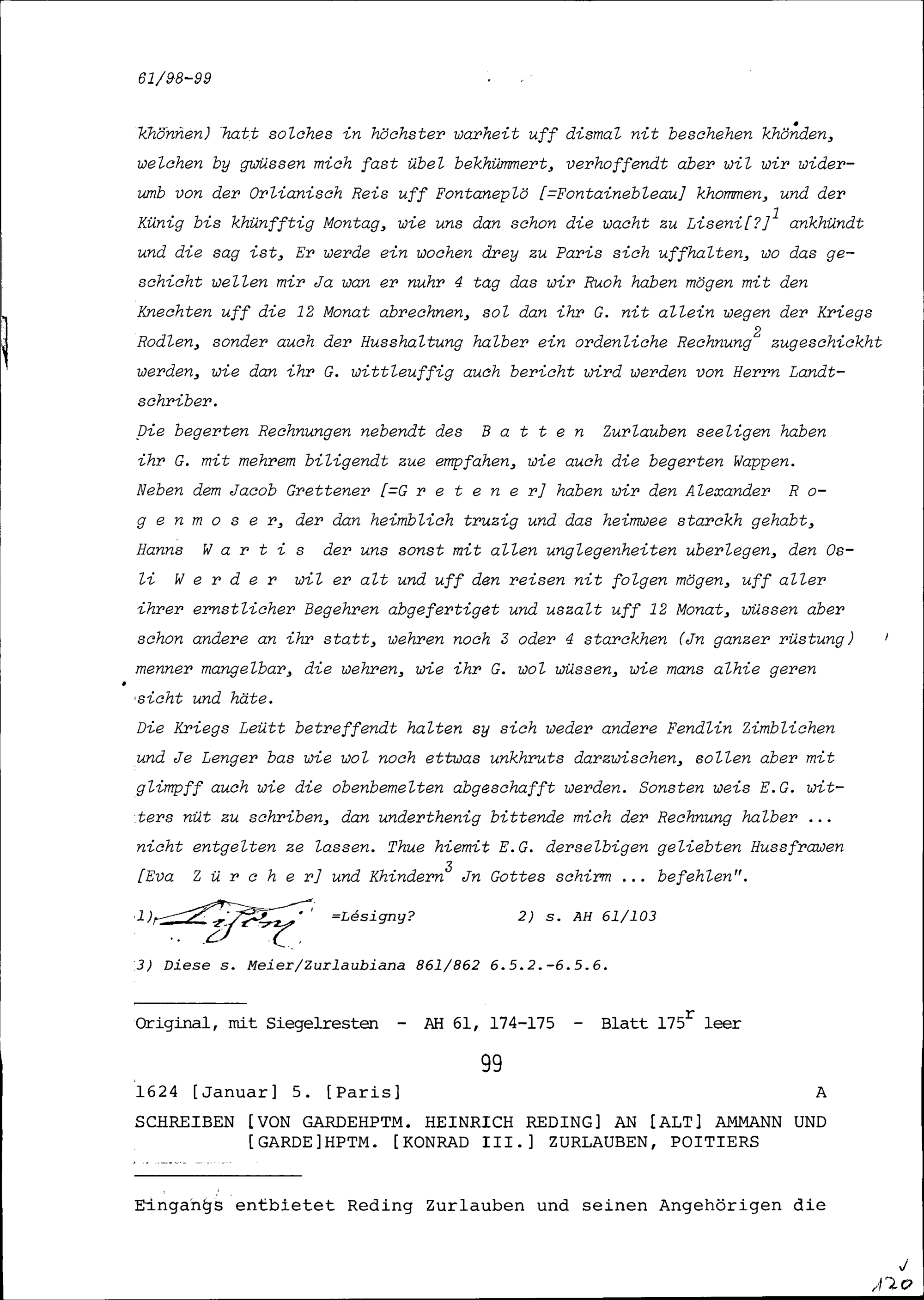 Schreiben von Georg Wey, Kompanieschreiber an Konrad III. Zurlauben, Hauptmann und Altammann, Zug