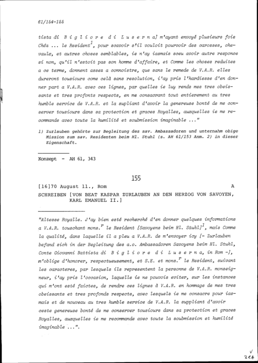 Schreiben von Beat Kaspar Zurlauben an Karl Emanuel II., Herzog von Savoyen