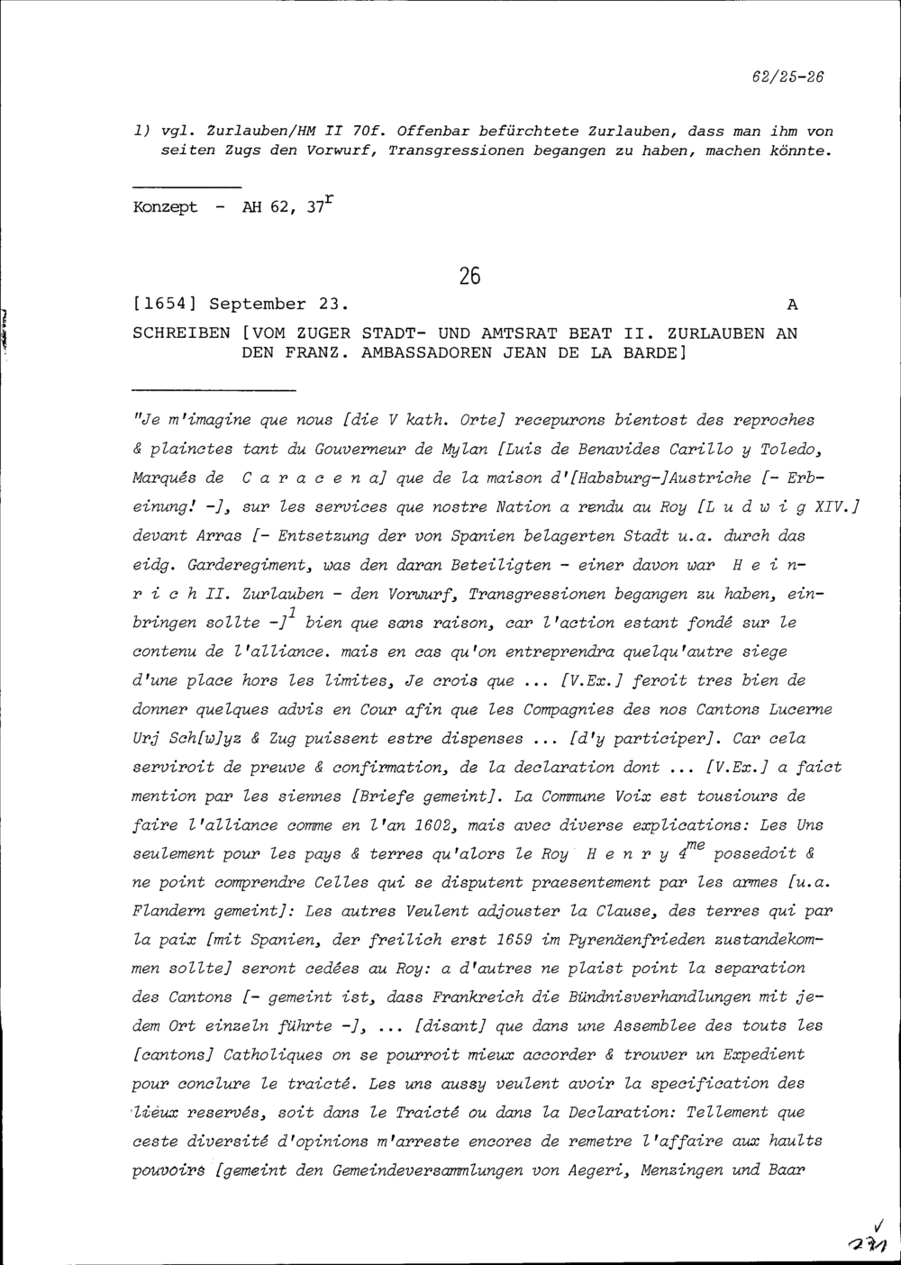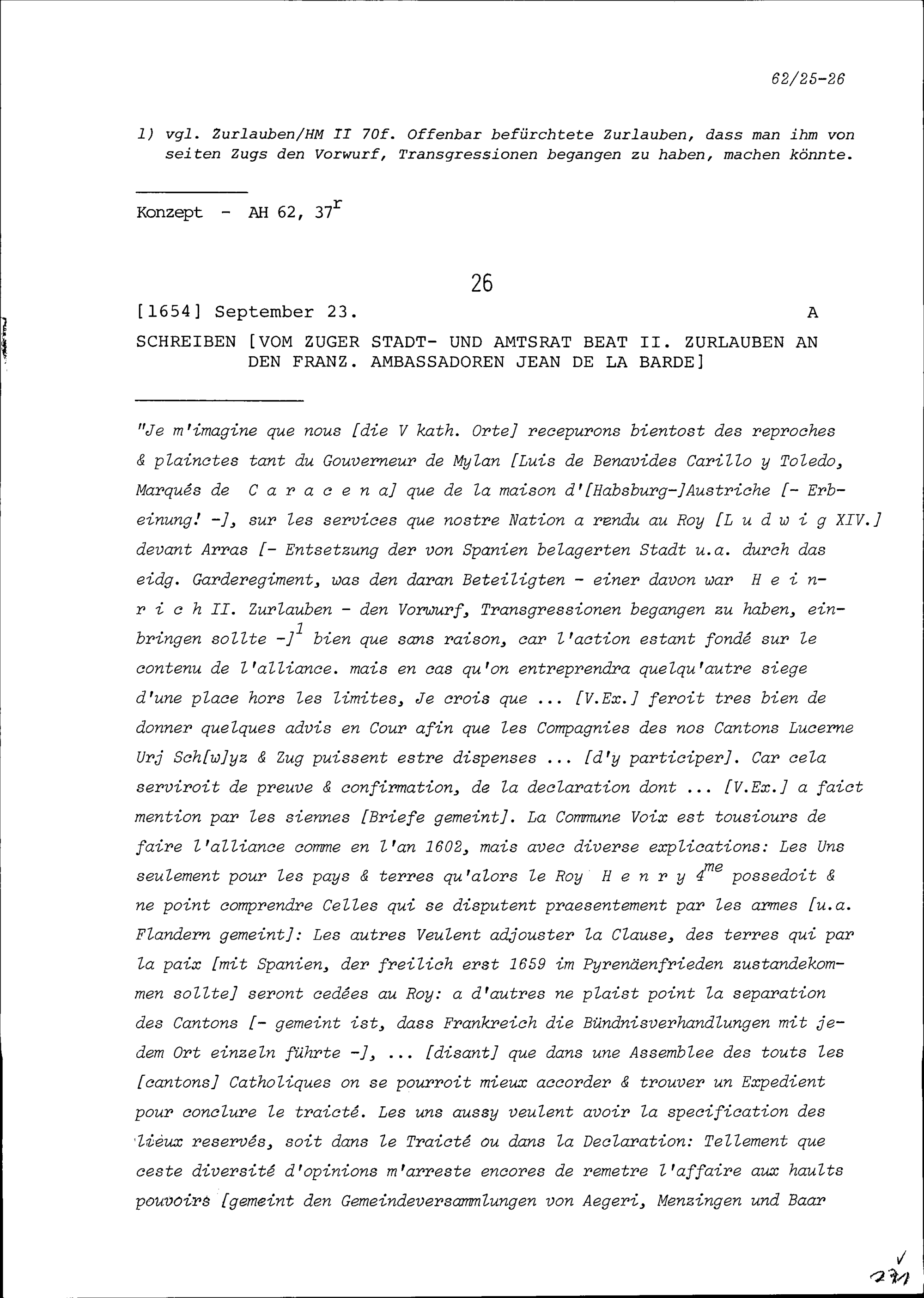 Schreiben von Beat II. Zurlauben, Stadt- und Amtrat Zug, an Jean de la Barde, Ambassador von Frankreich
