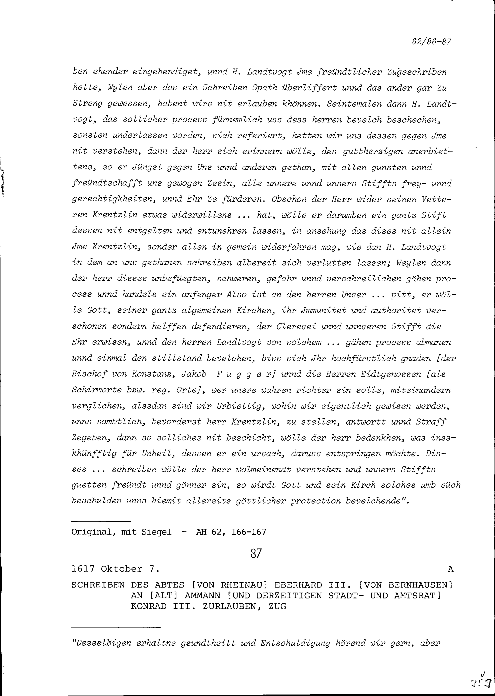 Schreiben des Propsts und Kapitels des Stifts Sankt Verena an Konrad III. Zurlauben, Ammann, Zug