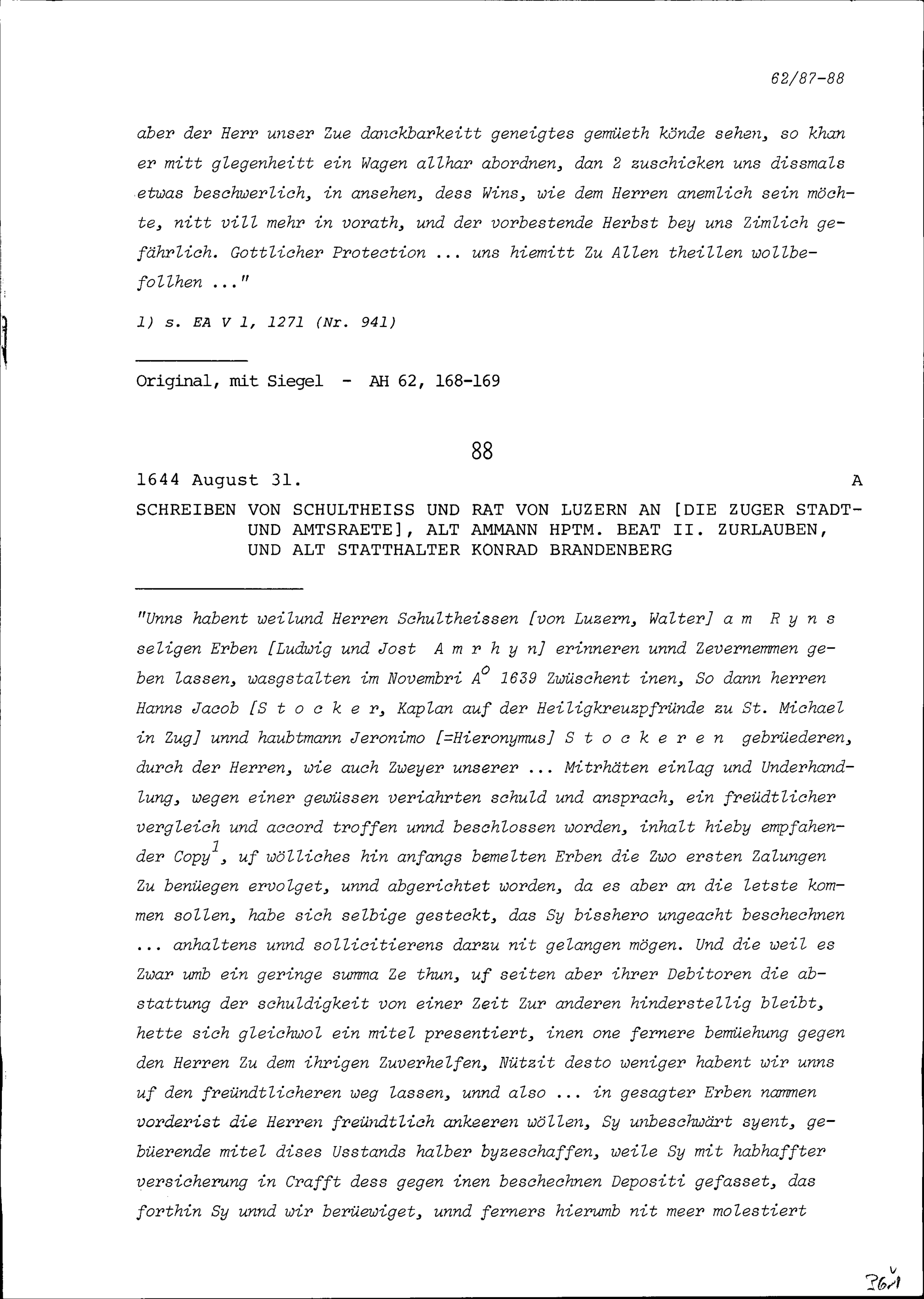 Schreiben von Eberhard III. von Bernhausen, Abt von Rheinau, an Konrad III. Zurlauben, Altammann und Stadt- und Amtrat, Zug