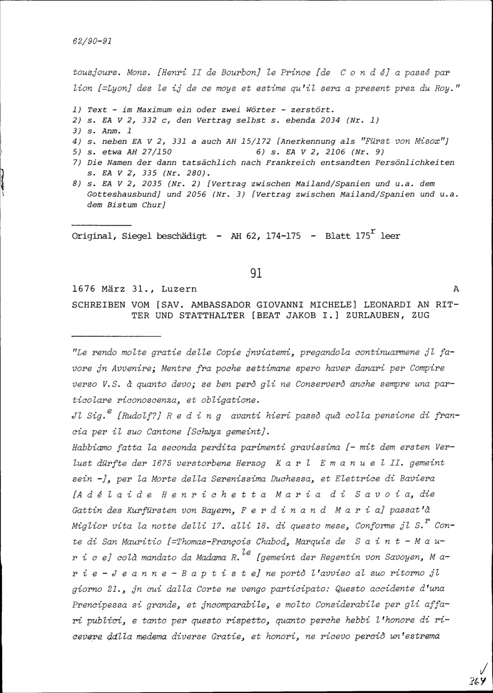 Schreiben von Robert Miron, Ambassador von Frankreich, an Konrad III. Zurlauben, Altammann und Stadt- und Amtrat, Zug