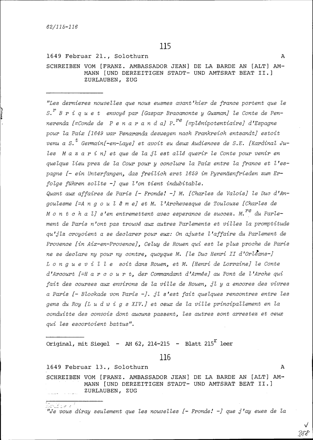 Schreiben von Jean de la Barde, Ambassador von Frankreich, an Beat II. Zurlauben,...