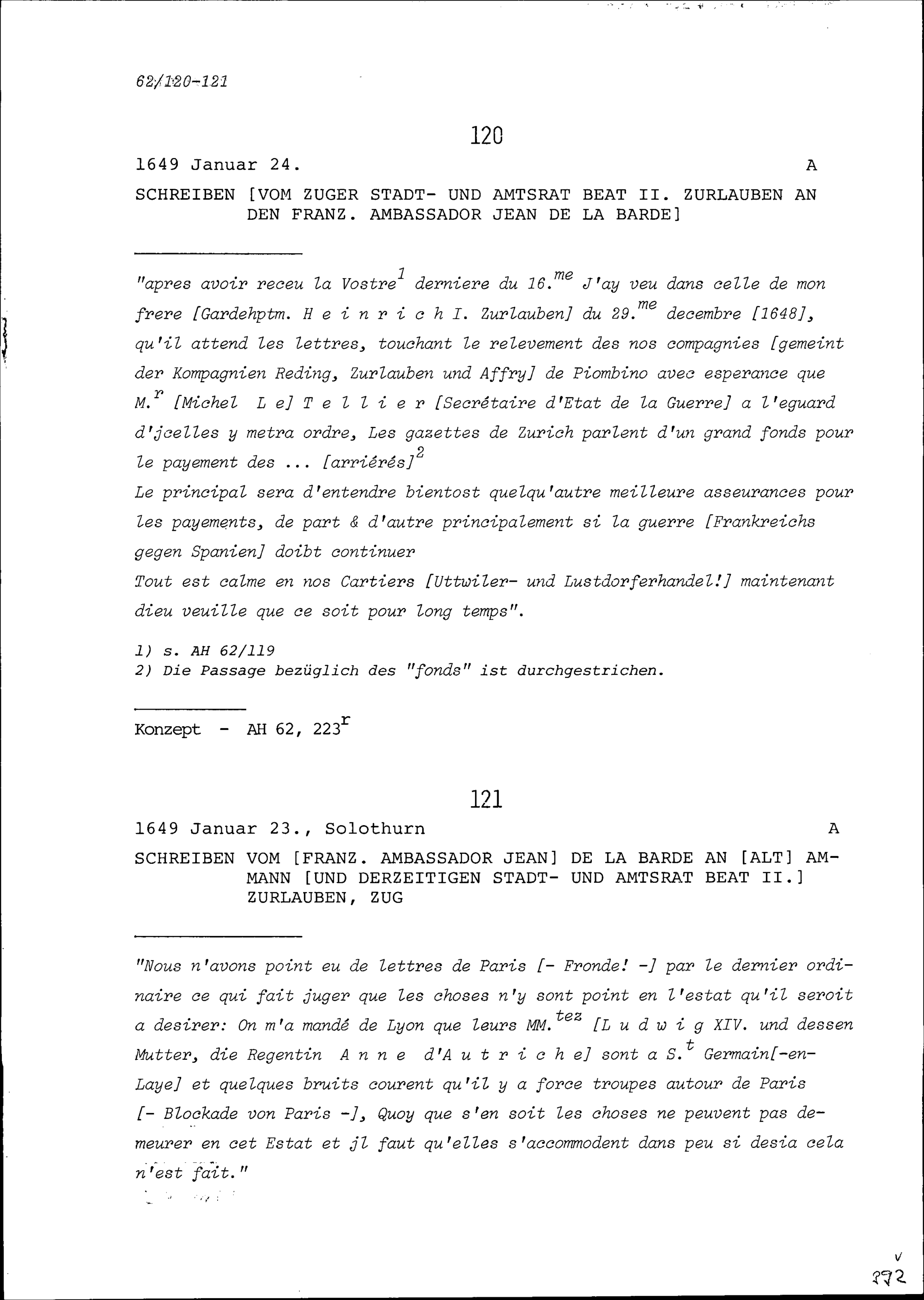 Schreiben von Jean de la Barde, Ambassador von Frankreich, an Beat II. Zurlauben,...