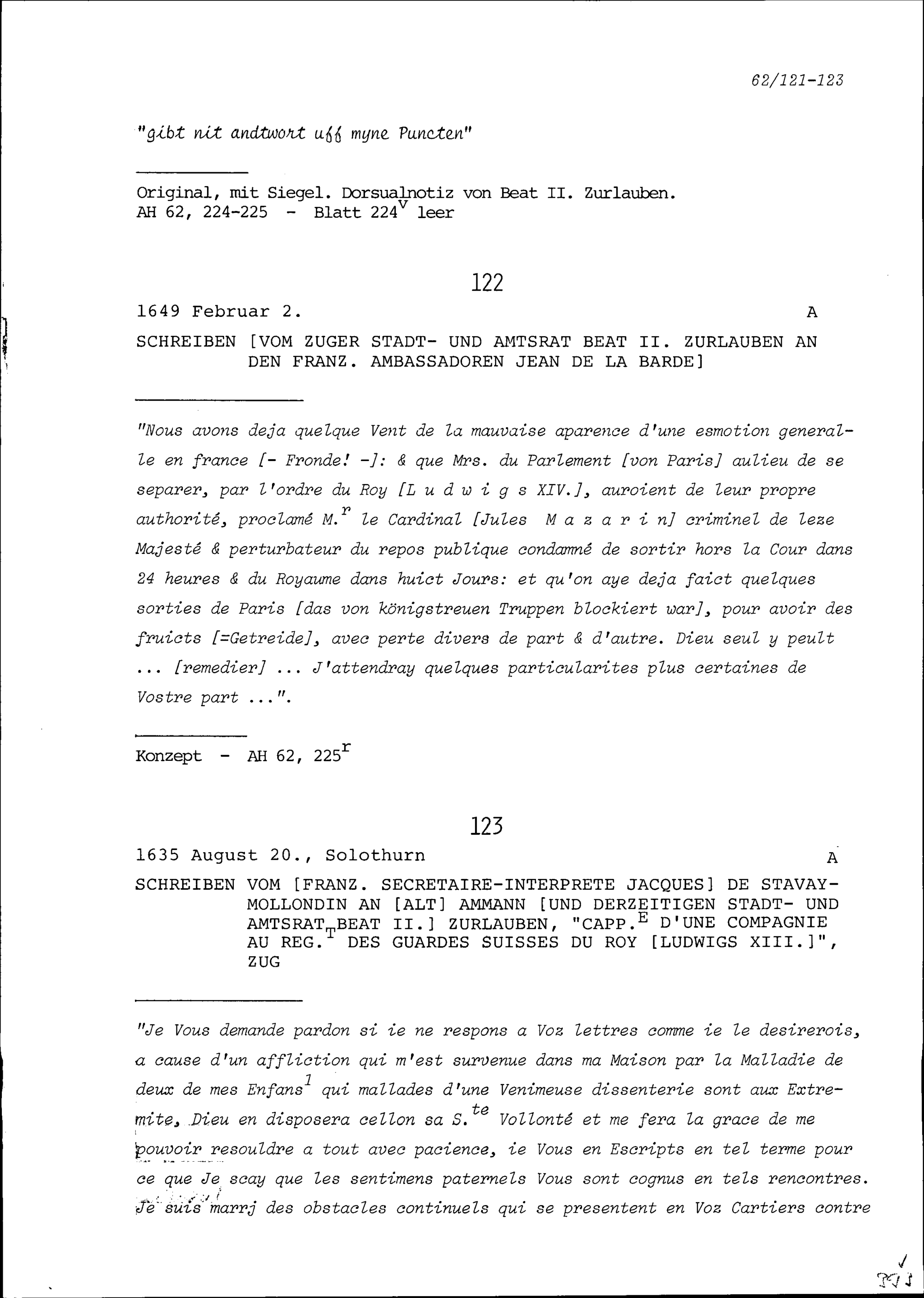 Schreiben von Jean de la Barde, Ambassador von Frankreich, an Beat II. Zurlauben,...