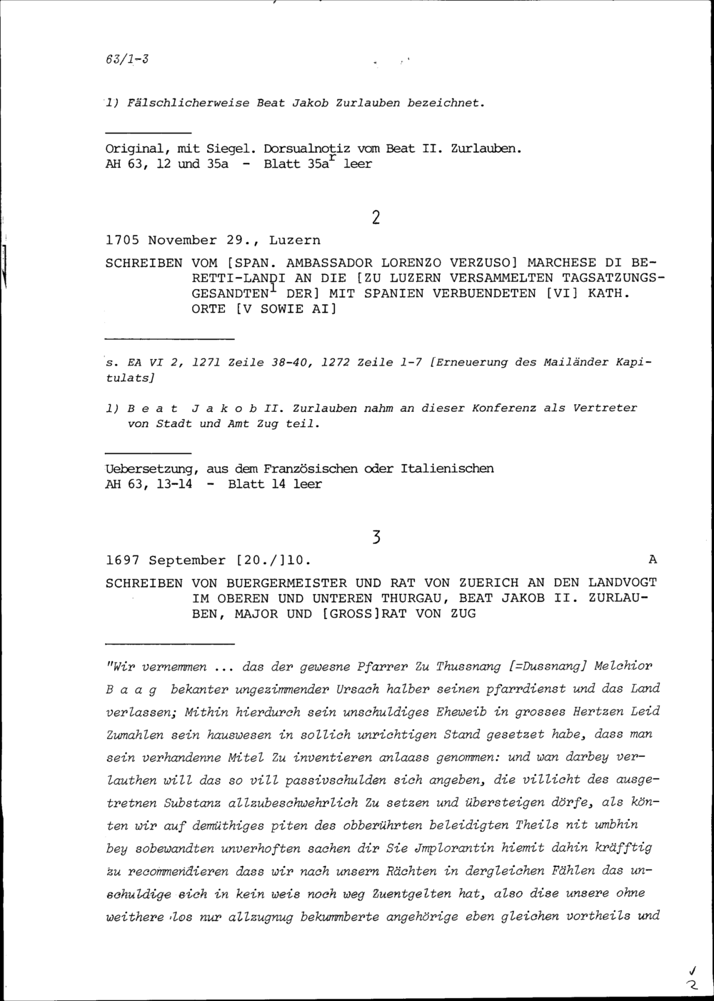 Schreiben des Bürgermeisters und Rats Zürich an Beat Jakob II. Zurlauben, Landvogt...