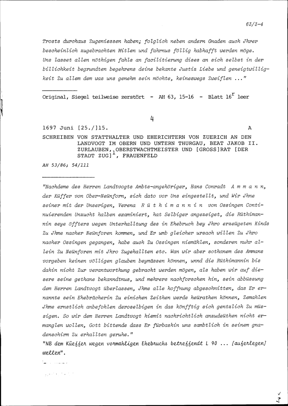 Schreiben des Bürgermeisters und Rats Zürich an Beat Jakob II. Zurlauben, Landvogt...