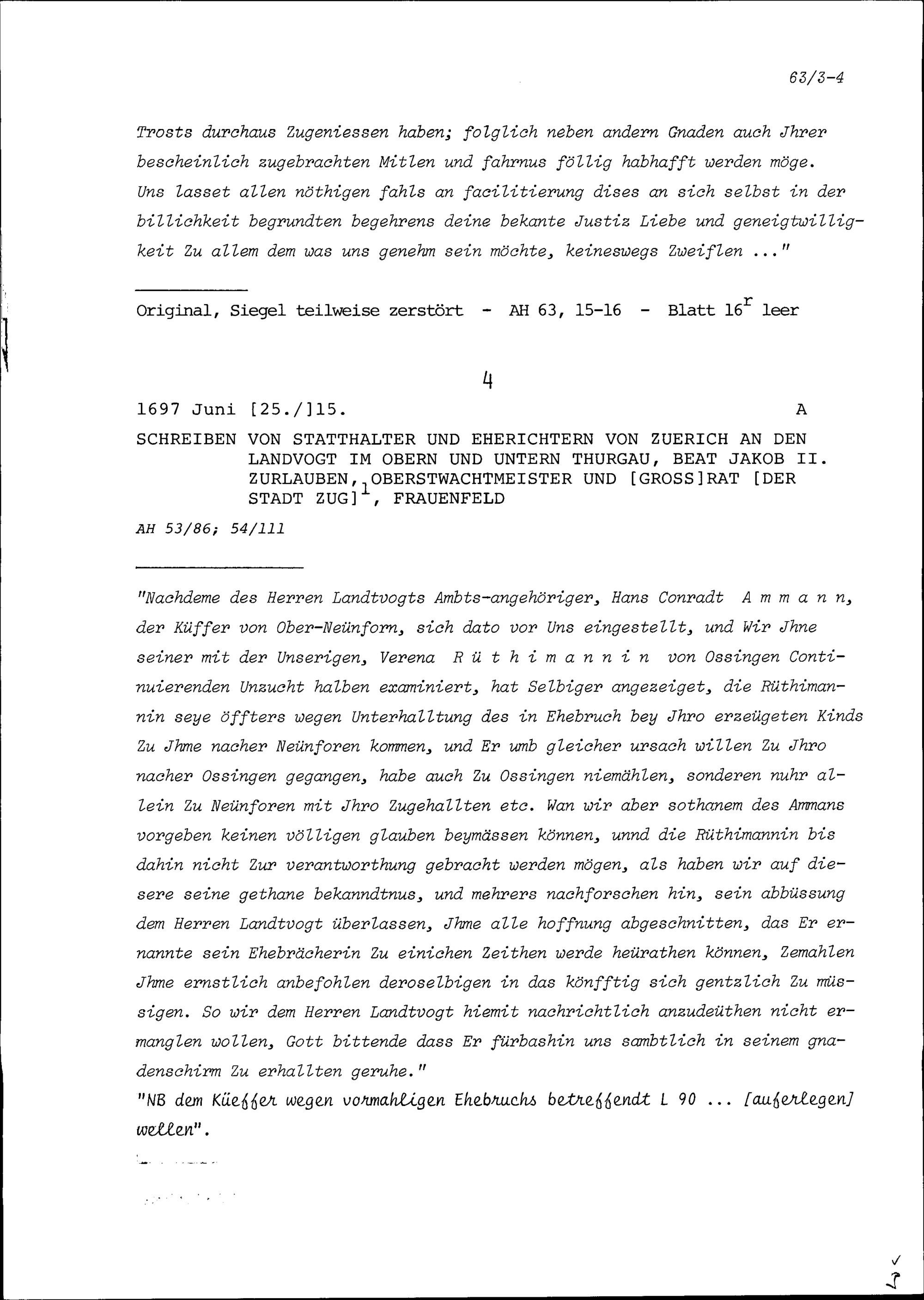 Schreiben des Bürgermeisters und Rats Zürich an Beat Jakob II. Zurlauben, Landvogt im Oberen und Unteren Thurgau, Major und Grossrat von Zug