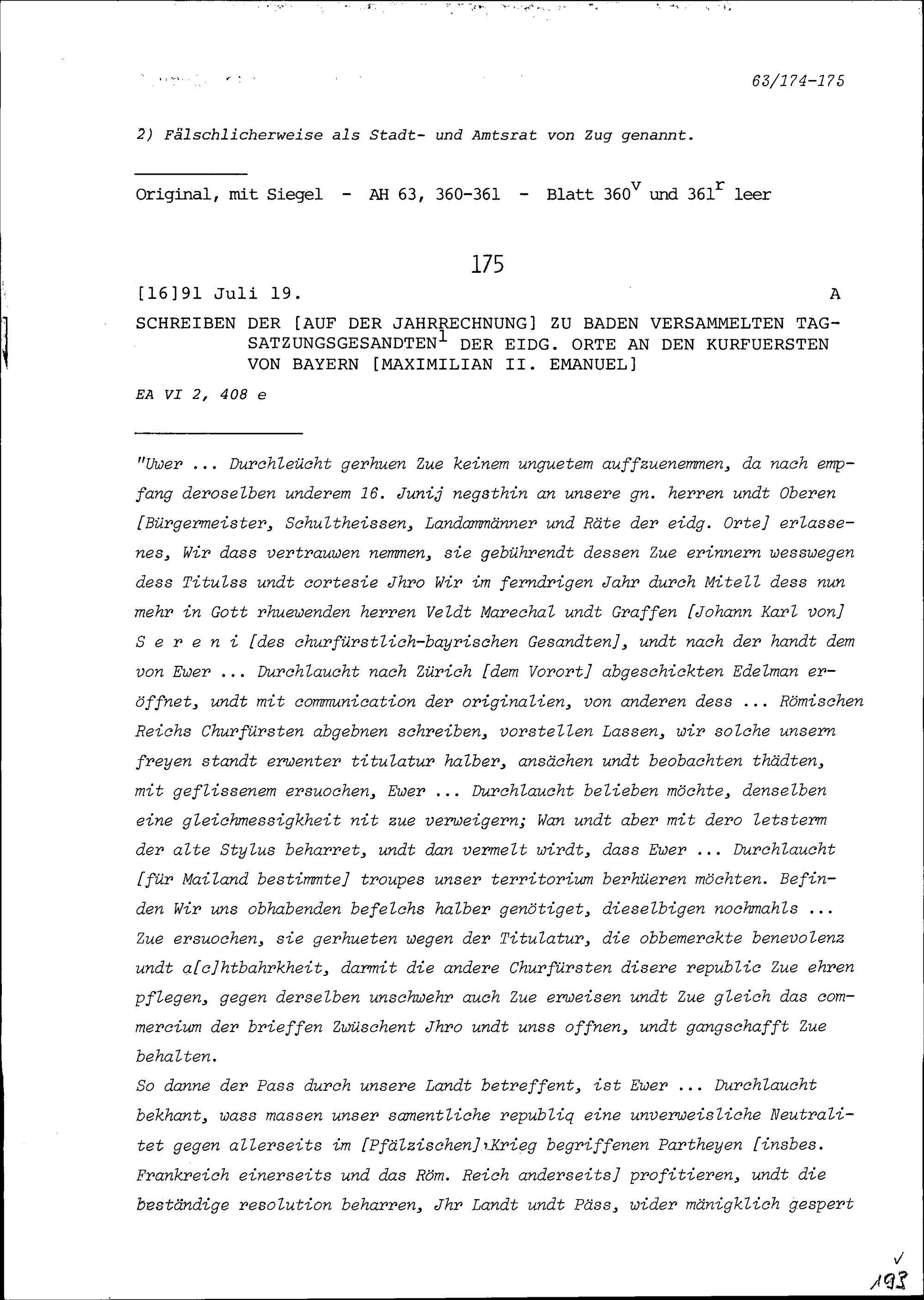 Schreiben von NN Molinier, Kellner des Komturs von Tobel Karl Philipp, Graf von Freytag, Grossprior von Ungarn, an Beat Jakob II. Zurlauben, Landvogt im Obern und Unteren Thurgau, Frauenfeld