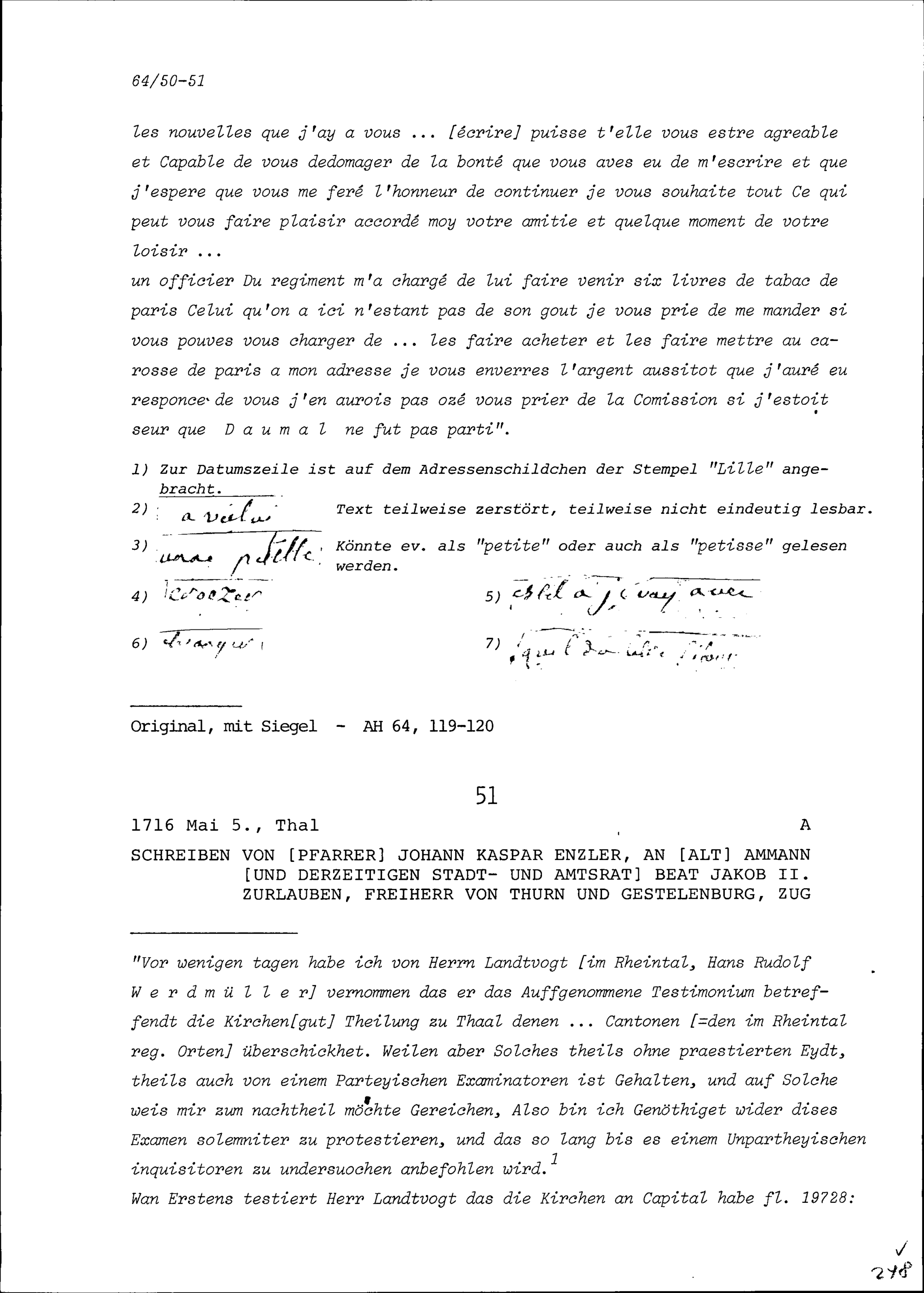 Schreiben von Richardot de Choisey an Beat Fidel Zurlauben, Leutnant der Schweizer...