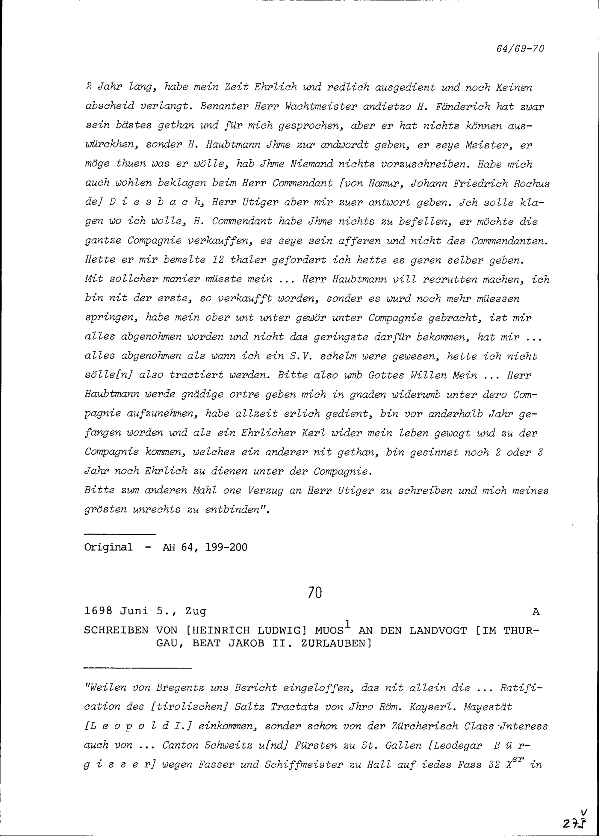 Schreiben von Hans Georg Resch, ehemals Soldat in der Kompanie Zurlauben im Regiment Pfyffer, an Beat Jakob II. Zurlauben, Kompanieinhaber und Hauptmann