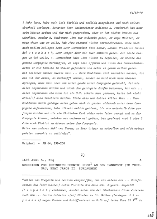 Schreiben von Hans Georg Resch, ehemals Soldat in der Kompanie Zurlauben im Regiment...