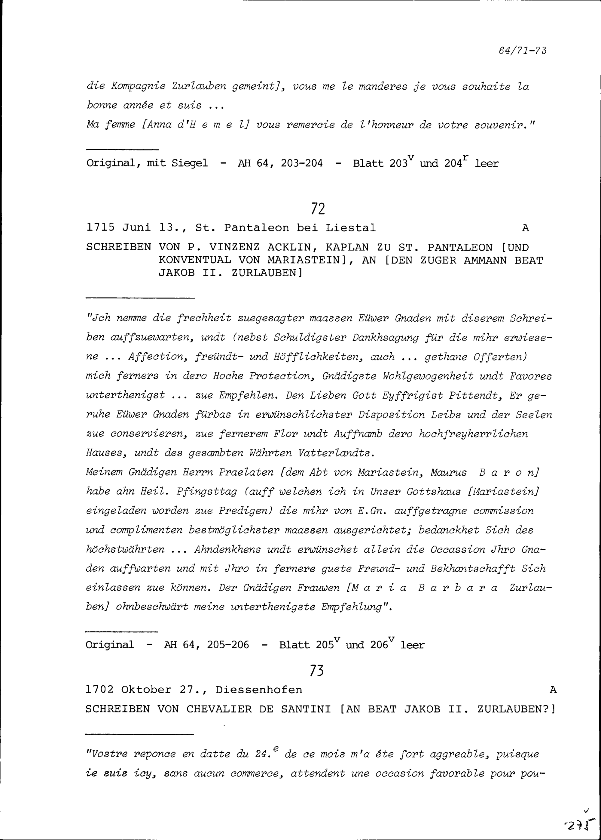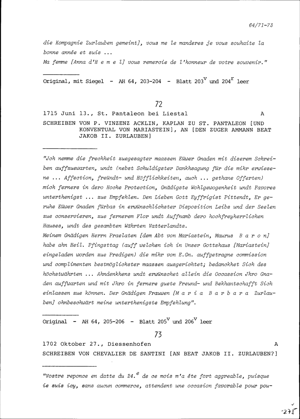 Schreiben von Franz Ludwig Pfyffer, Gardehauptmann, an Beat Fidel Zurlauben, Zug
