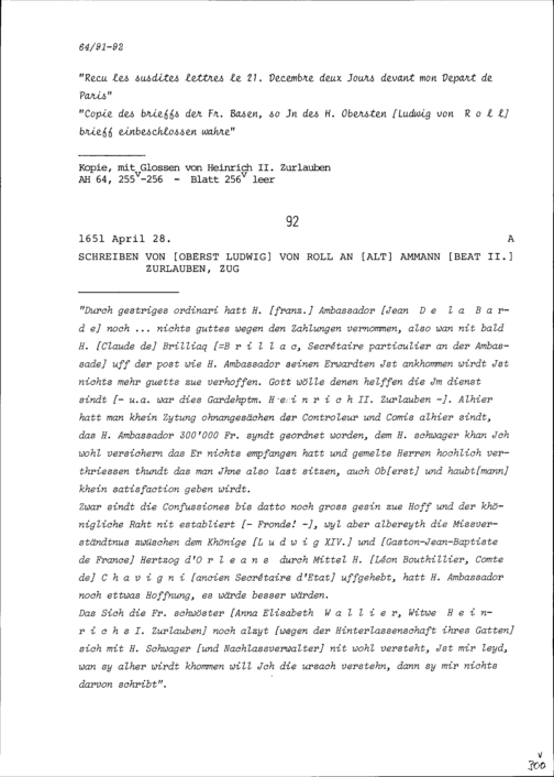 Schreiben von Anna Elisabeth Wallier, Witwe von Heinrich I. Zurlauben, Gardehauptmann, an Heinrich II. Zurlauben, Gardehauptmann