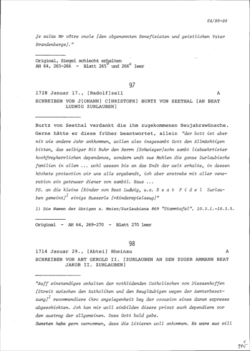 Schreiben von Gerold II. Zurlauben, Abt von Rheinau, an Beat Jakob II. Zurlauben, Ammann
