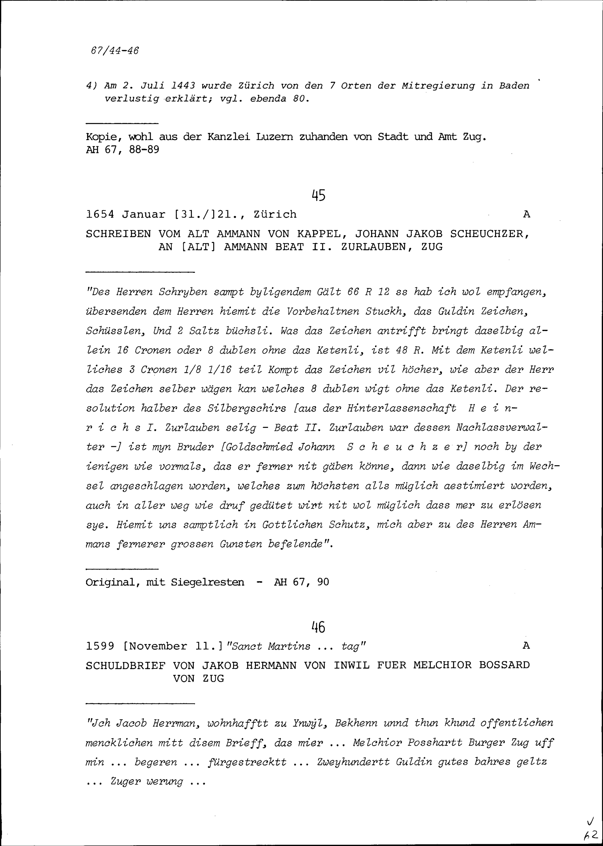 Schuldbrief von Jakob Hermann von Inwil für Melchior Bossard von Zug