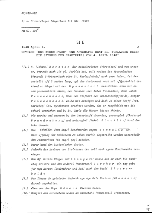 Notiz von Beat II. Zurlauben, Stadt- und Amtrat Zug, über die Sitzung des Stadtrats vom 4. April 1648