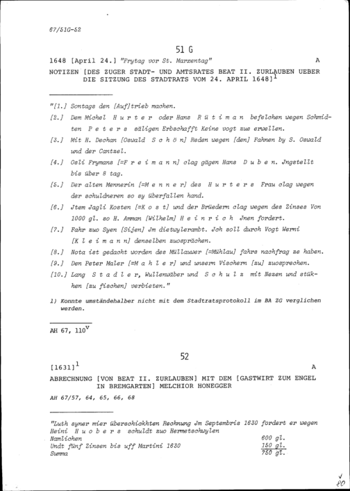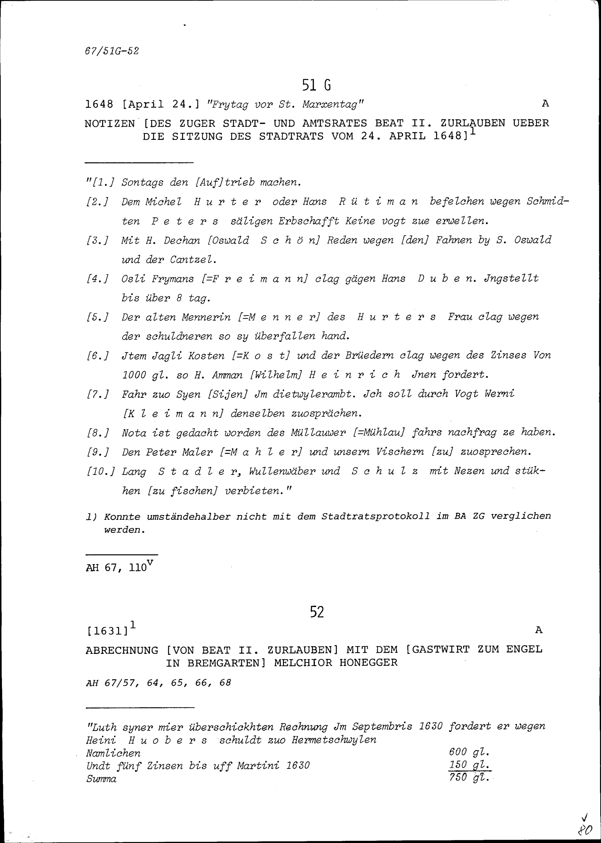 Abrechnung von Beat II. Zurlauben mit Melchior Honegger, Gastwirt zum Engel in Bremgarten