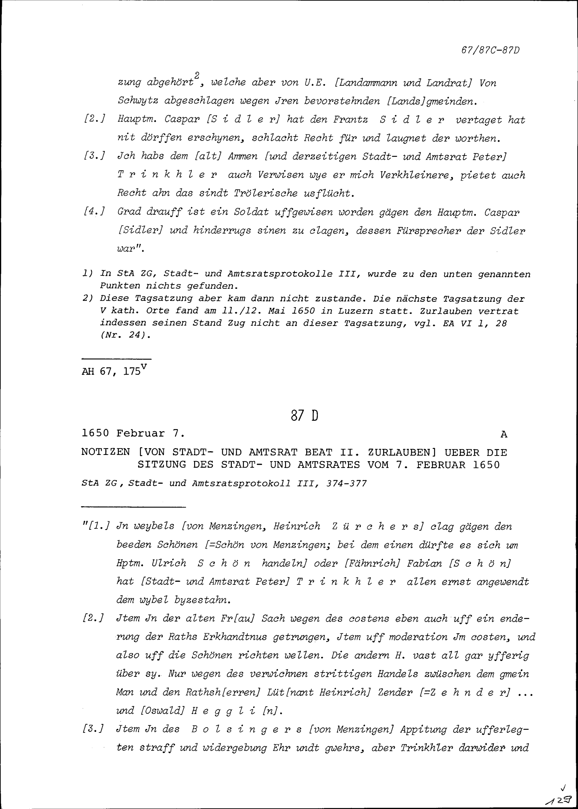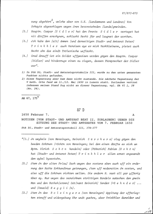 Notiz von Beat II. Zurlauben, Stadt- und Amtrat, über die Sitzung des Stadt- und Amtrats vom 13. April 1650