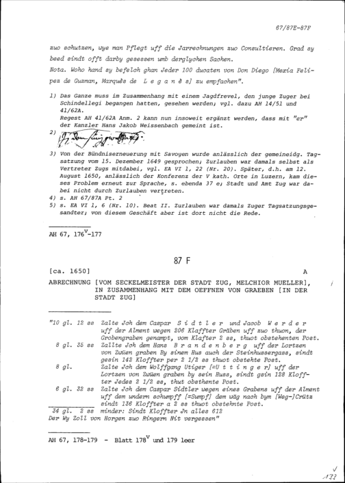 Notiz von Beat II. Zurlauben, Stadt- und Amtrat, über die Sitzung des Stadt- und Amtrats vom 5. März 1650