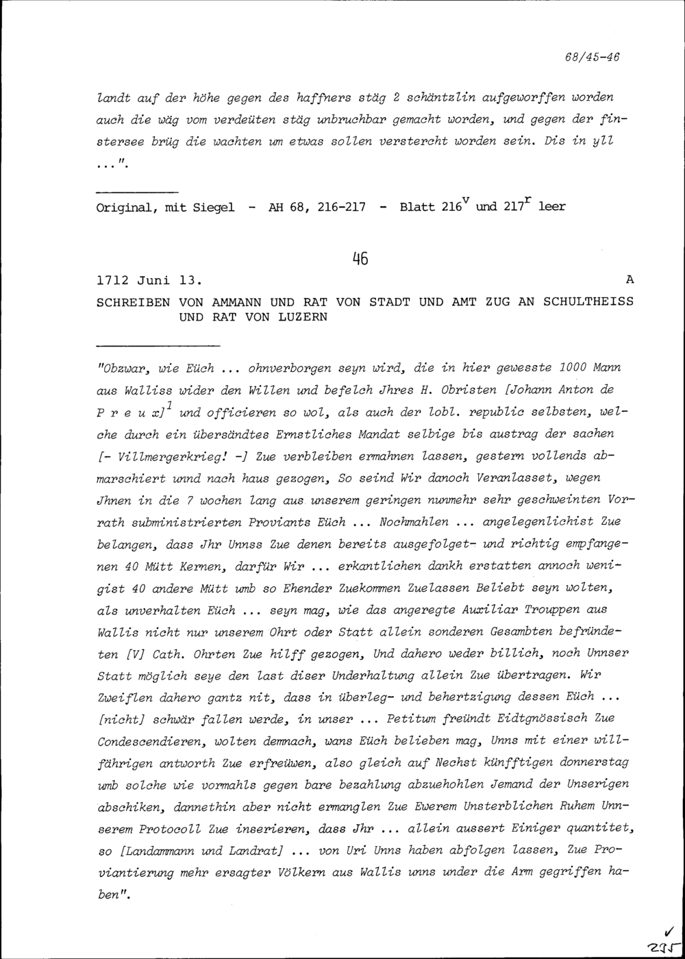 Schreiben von Klemens Damian Weber, Stadt- und Amtrat Zug, an Johann Rudolf Kreuel, Stadt- und Amtmajor, Altlandvogt der Grafschaft Baden, im Lager zu Baar