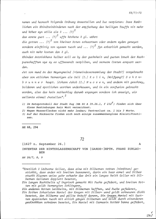 Notiz von Beat II. Zurlauben, Stabführer der Stadt Zug, über den Versuch gewisse Missbräuche bei Taufen zu unterbinden