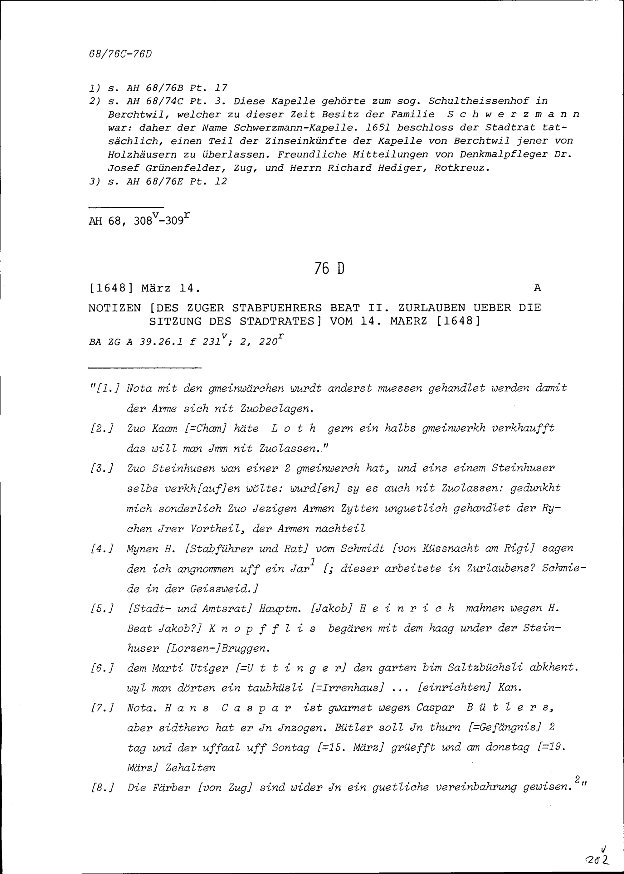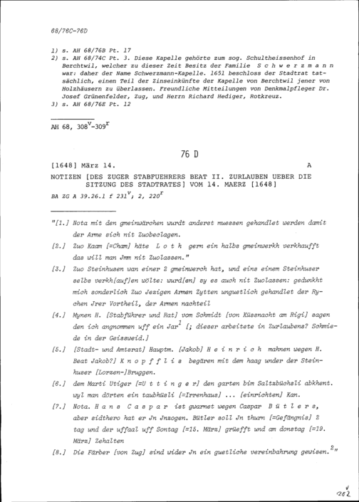 Notiz von Beat II. Zurlauben, Stabführer der Stadt Zug, über die Sitzung des Stadtrats vom 7. März 1648