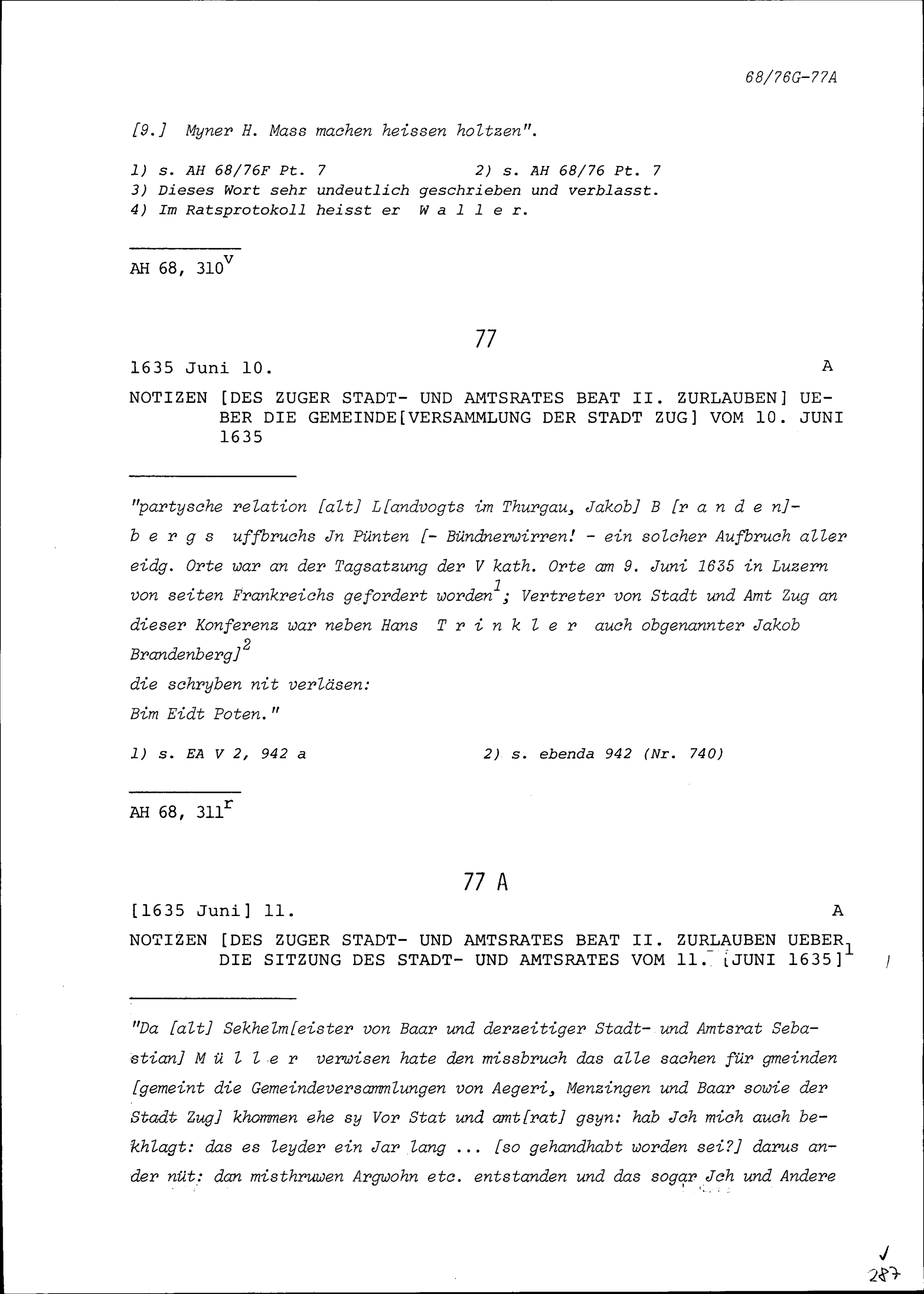 Notiz von Beat II. Zurlauben, Stabführer der Stadt Zug, über die Sitzung des Stadtrats vom 8. Februar 1648