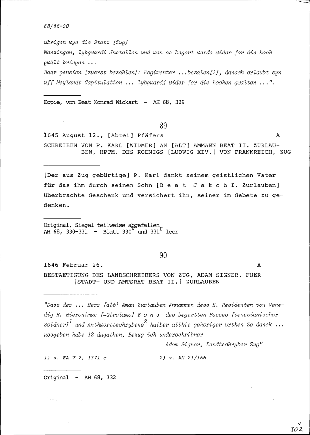 Beschluss der Gemeindeversammlung der Stadt Zug bezüglich des mailändisch-spanischen...