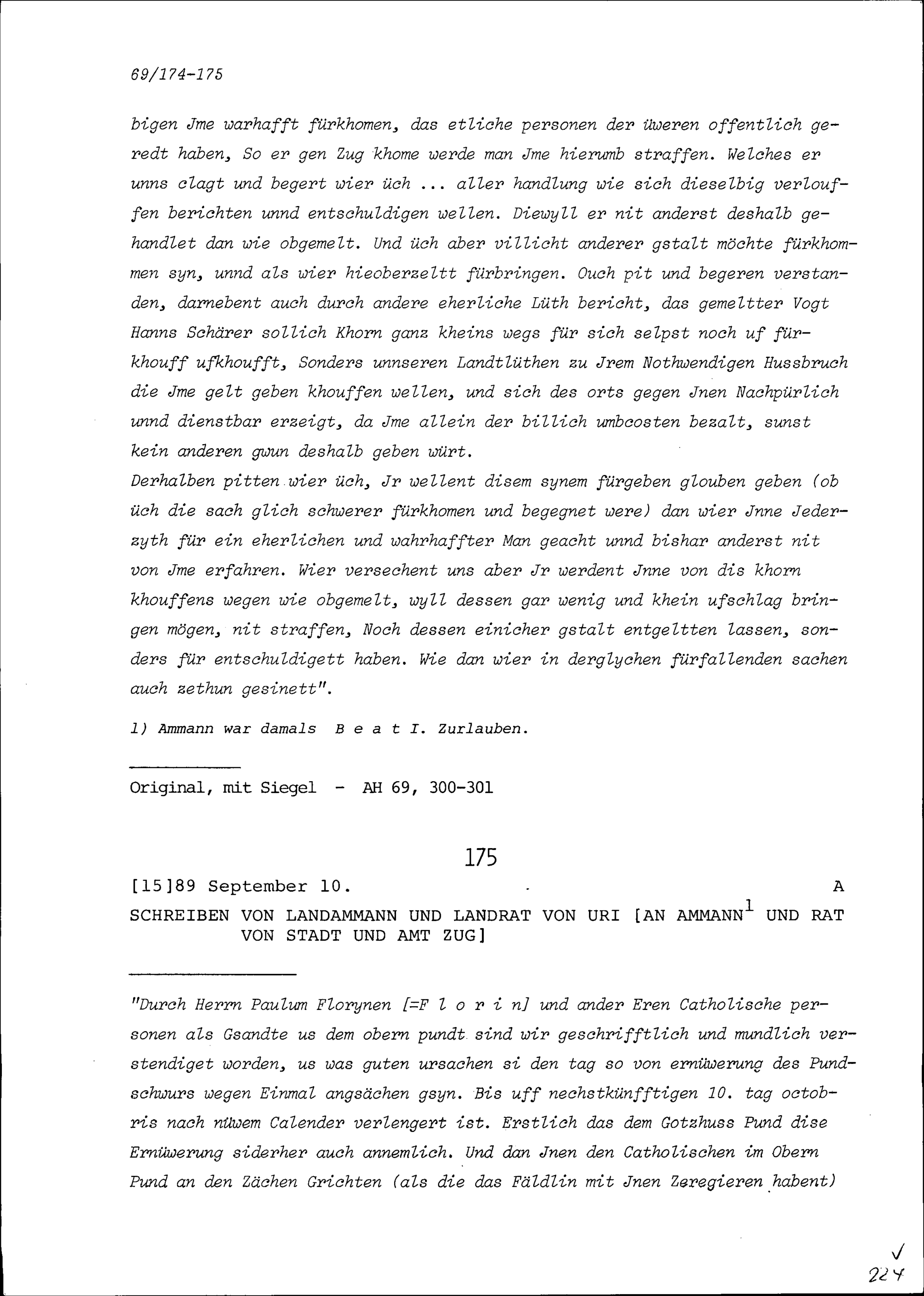 Schreiben des Statthalters und Landrats Uri an Ammann und Rat von Stadt und Amt Zug