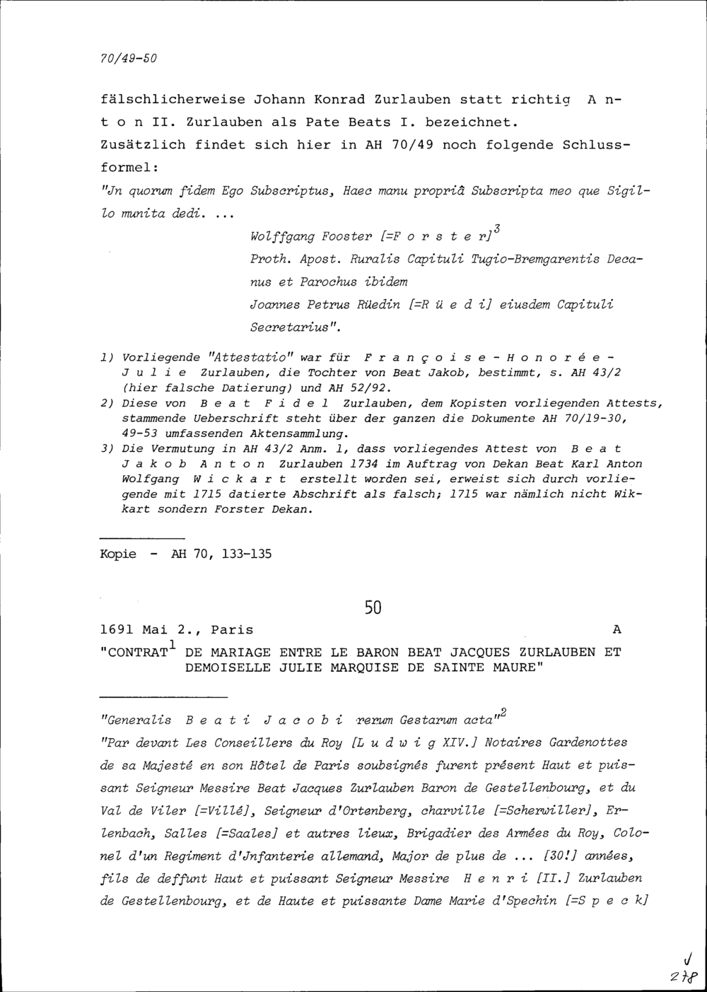 Taufbestätigung aus dem Pfarrbuch Sankt Michael für die Familie Zurlauben