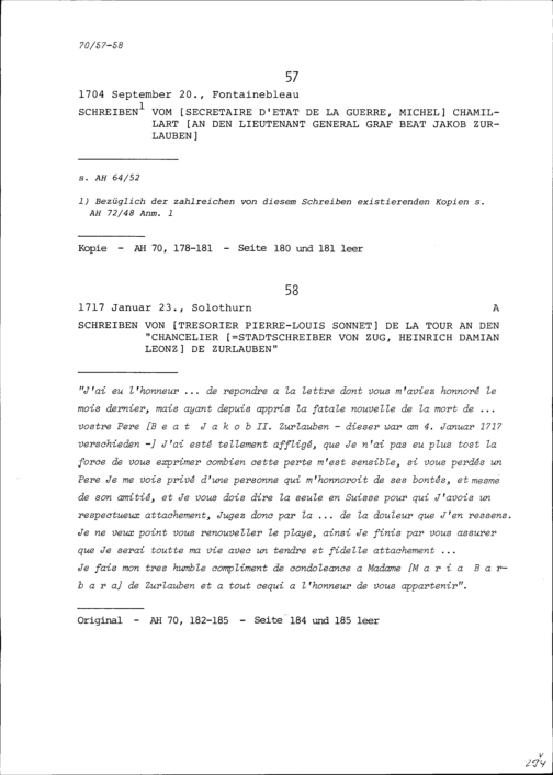 Schreiben von Pierre-Louis Sonnet de la Tour, Trésorier, an Heinrich Damian Leonz Zurlauben, Stadtschreiber von Zug