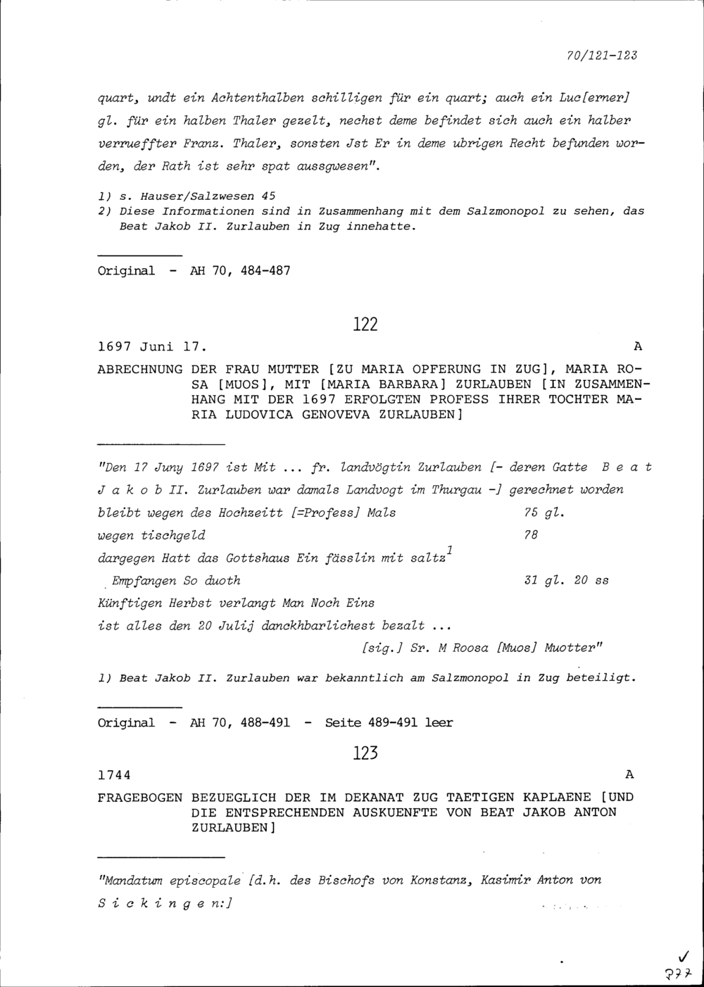 Fragebogen bezüglich der im Dekanat Zug tätigen Kapläne, Auskünfte von Beat Jakob Anton Zurlauben