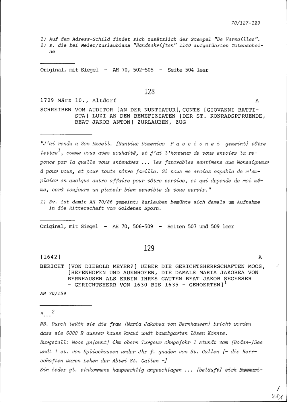 Bericht von Diebold Meyer über die Gerichtsherrschaften Moos, Hefenhofen und Auenhofen die damals Maria Jakobea von Bernhausen als Erbin von Beat Jakob Segesser, ihrem Gatten gehörten