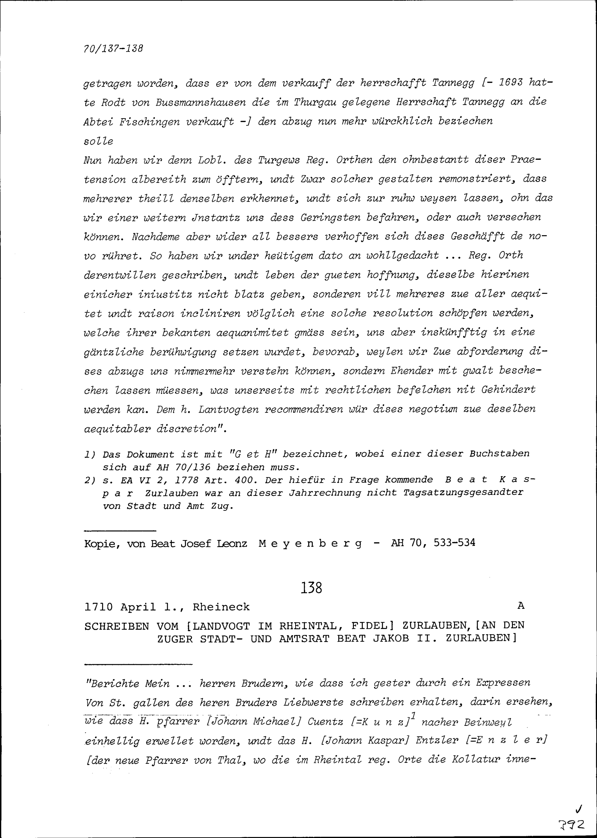 Schreiben von Marquard Rudolf Rodt von Bausmannshausen, Bischof von Konstanz, an Beat Jakob II. Zurlauben, Landvogt im Thurgau