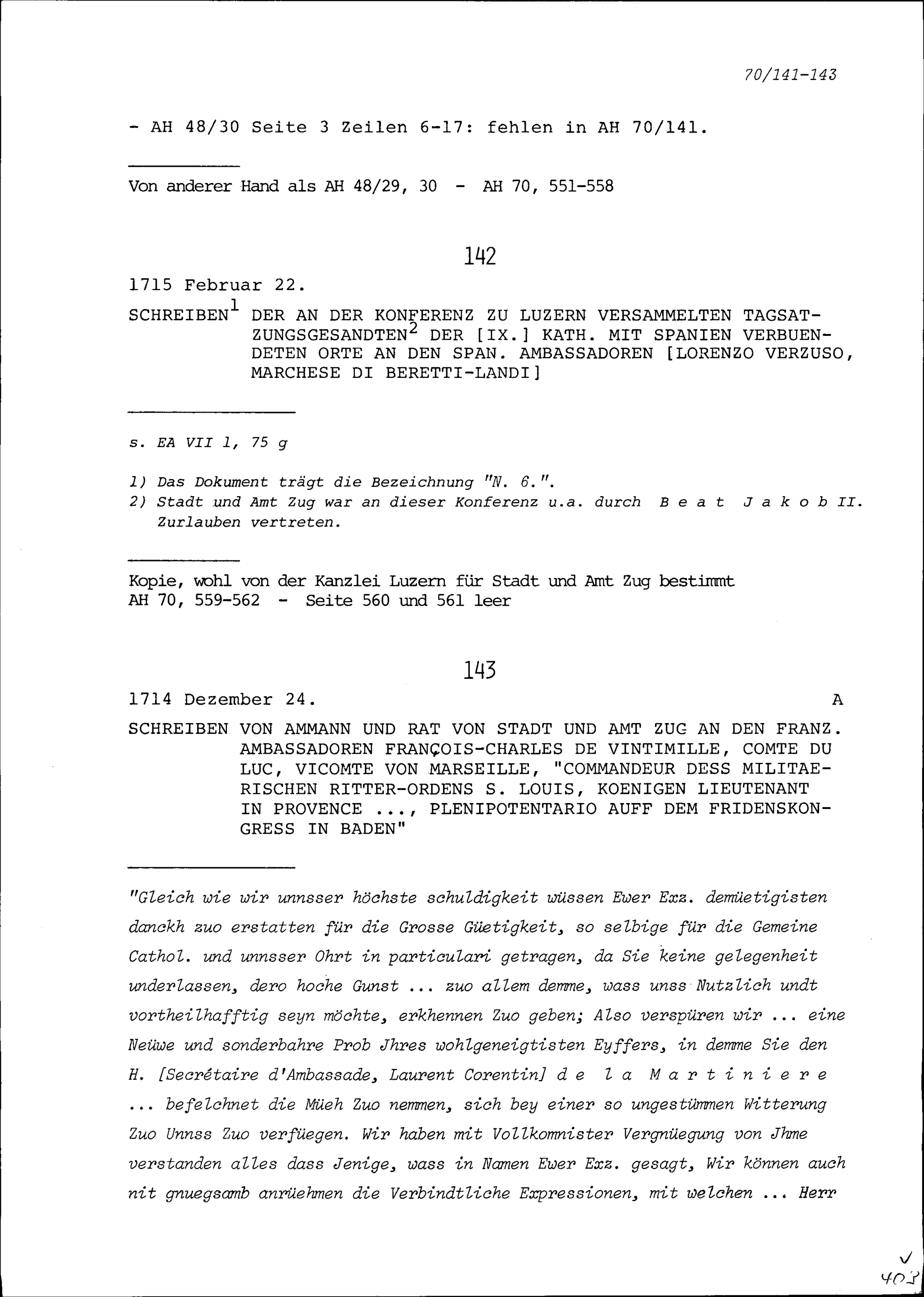 Schreiben des Ammanns und Rats von Stadt und Amt Zug an François-Charles de Vintimille, Graf du Luc, Ambassador von Frankreich, Vicomte von Marseille, auf dem Friedenskongress in Baden