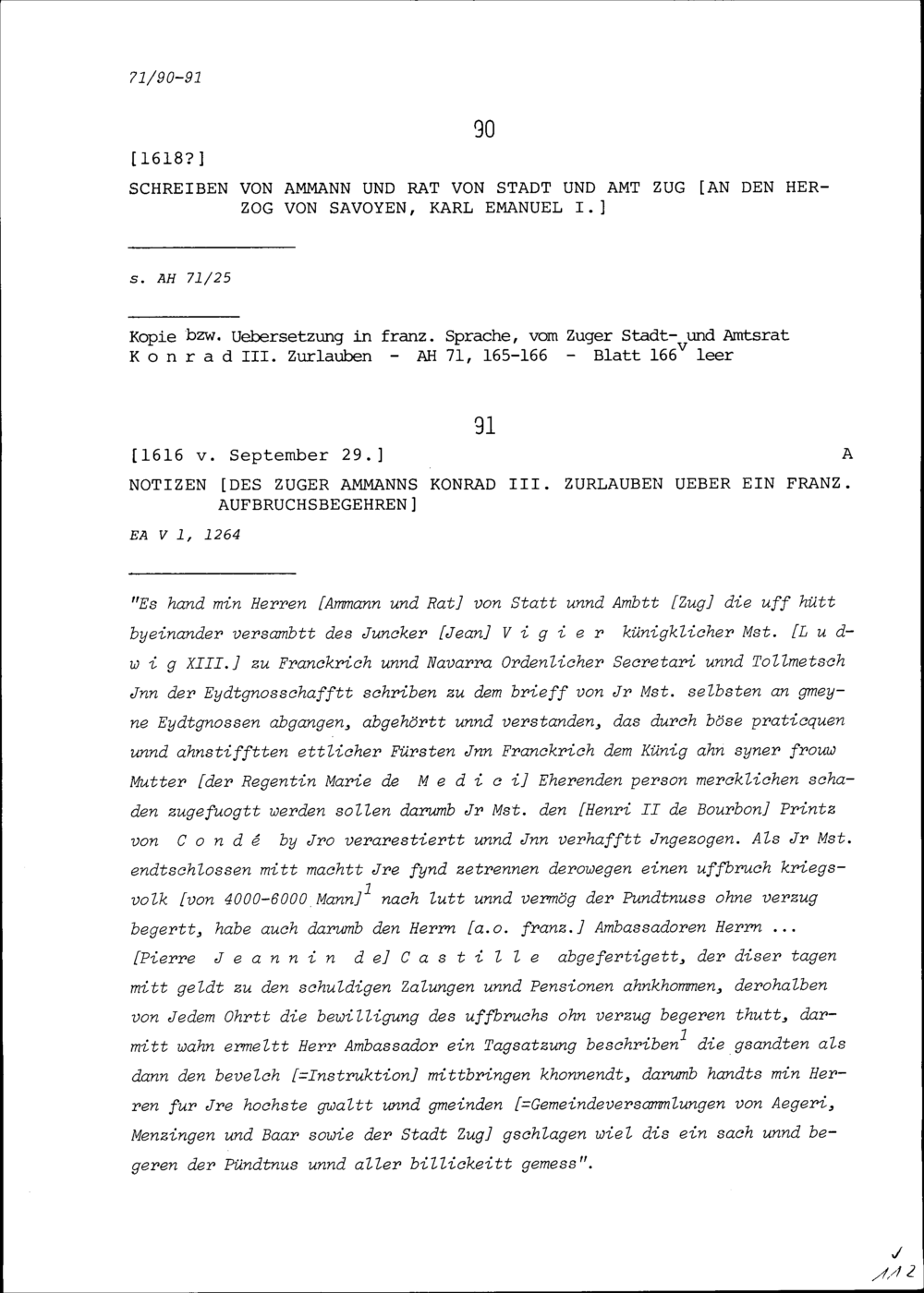 Notiz von Konrad III. Zurlauben, Ammann Zug, über ein französisches Aufbruchsbegehren