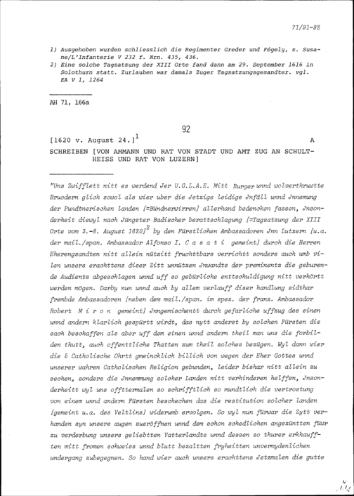 Notiz von Konrad III. Zurlauben, Ammann Zug, über ein französisches Aufbruchsbegehren