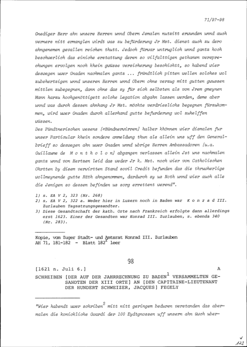 Schreiben der Gesandten der Dreizehn Katholischen Orte in Baden an Robert Miron, Ambassador von Frankreich